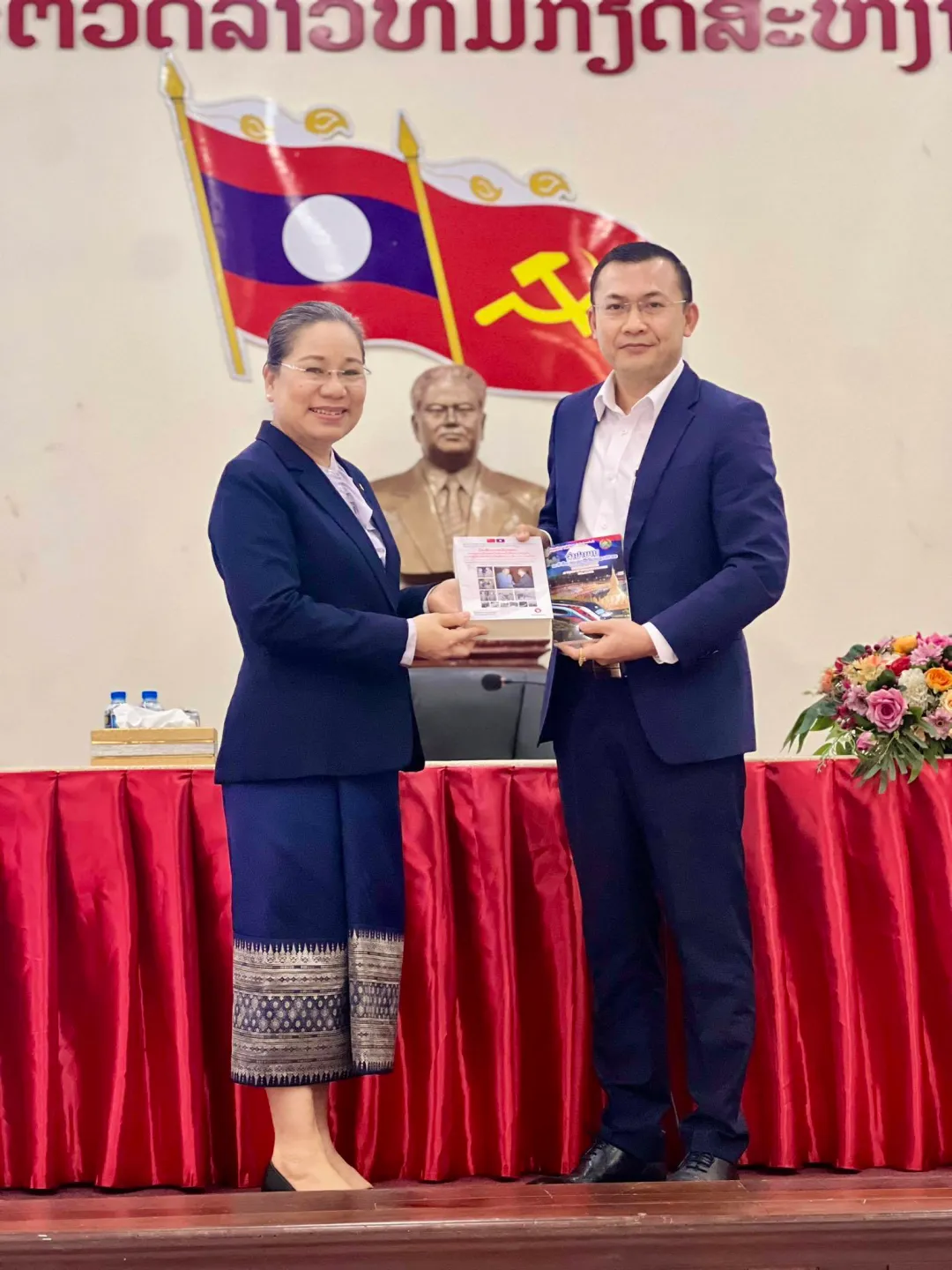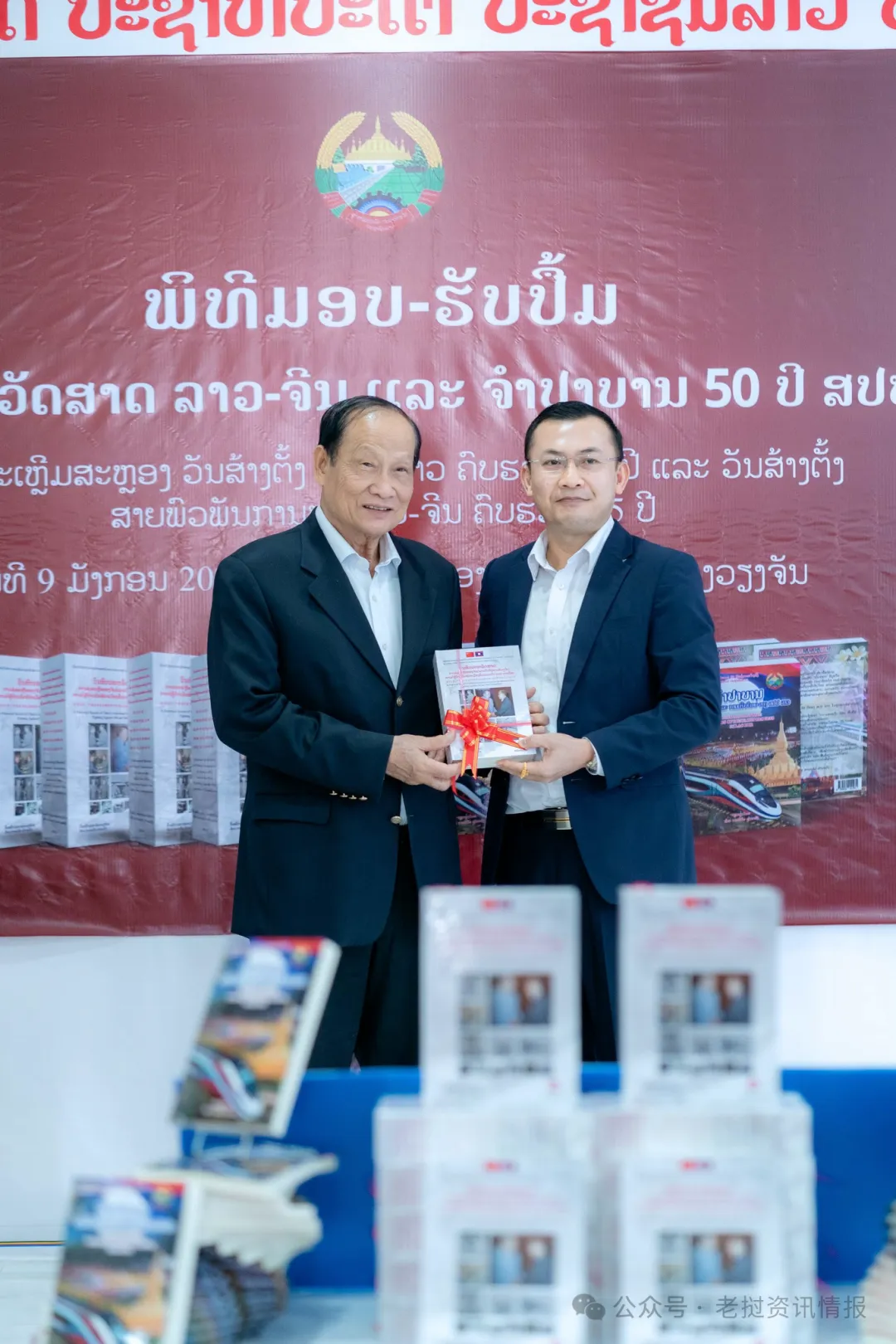 卡乔·塔马冯向老挝新闻文化旅游部部长赠送《中国援老抗战历史记录》书籍