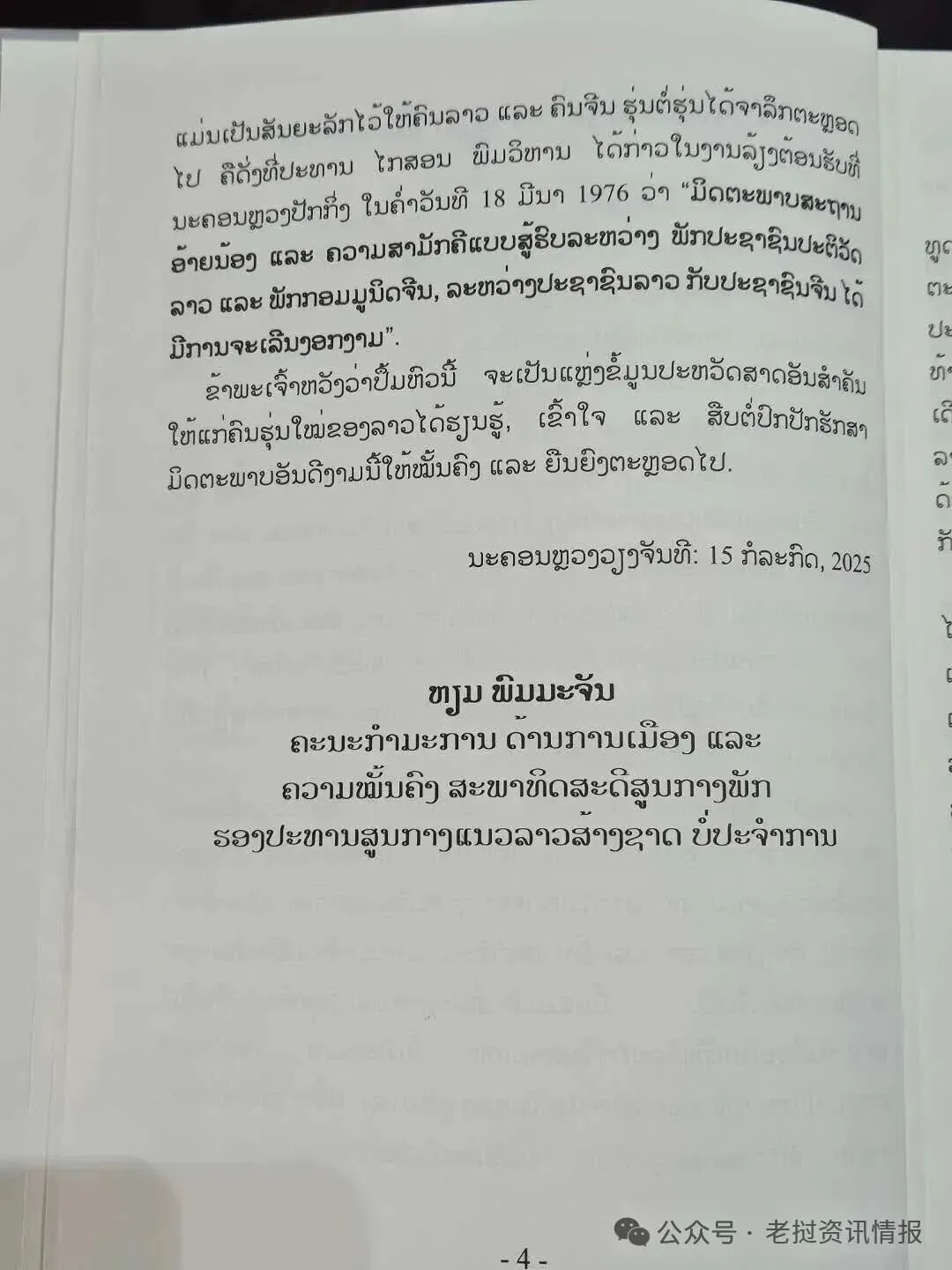 我们希望这本书将不仅是一份有价值的历史文献,不仅仅是为了庆祝两国建交65周年,更是对中国给予老挝巨大援助的肯定。 同时,也肯定了老中友谊以及老中在和平、稳定和地区及世界发展中的重要性。 愿这份长久的友谊永远向前发展。
