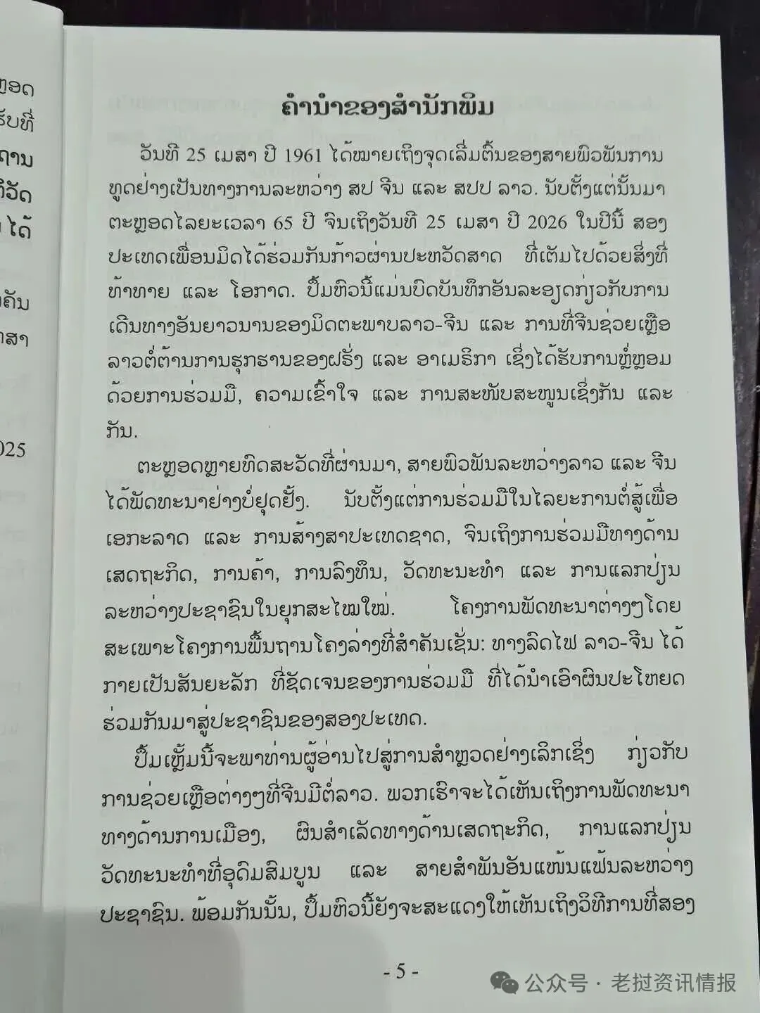 1961年4月25日标志着中国和老挝正式建立外交关系的起点。 从那时起至今已有65年(至2026年4月25日)。 在这一年里,两个友好国家共同跨越了充满挑战和机遇的历史。 这本书是一份详尽的记录,记述了老中友谊的漫长旅程,以及中国援助老挝反抗法国和美国侵略的历史,这其中充满了相互的合作、理解和支持。