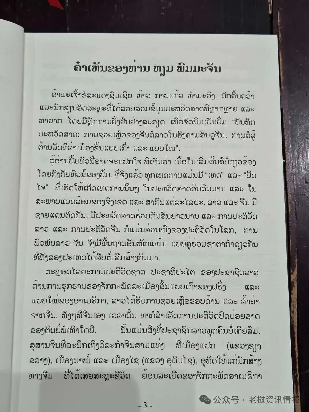 我借此机会请求谅解。我希望这本书能成为后来者拿去改进并在未来使其更加完善的基础。 为了表达诚意和感恩之情,我请求将本书的版权赠予老挝国家图书馆、老挝国家博物馆、老挝国家文化宫以及位于老挝境内的3处中国烈士陵园。