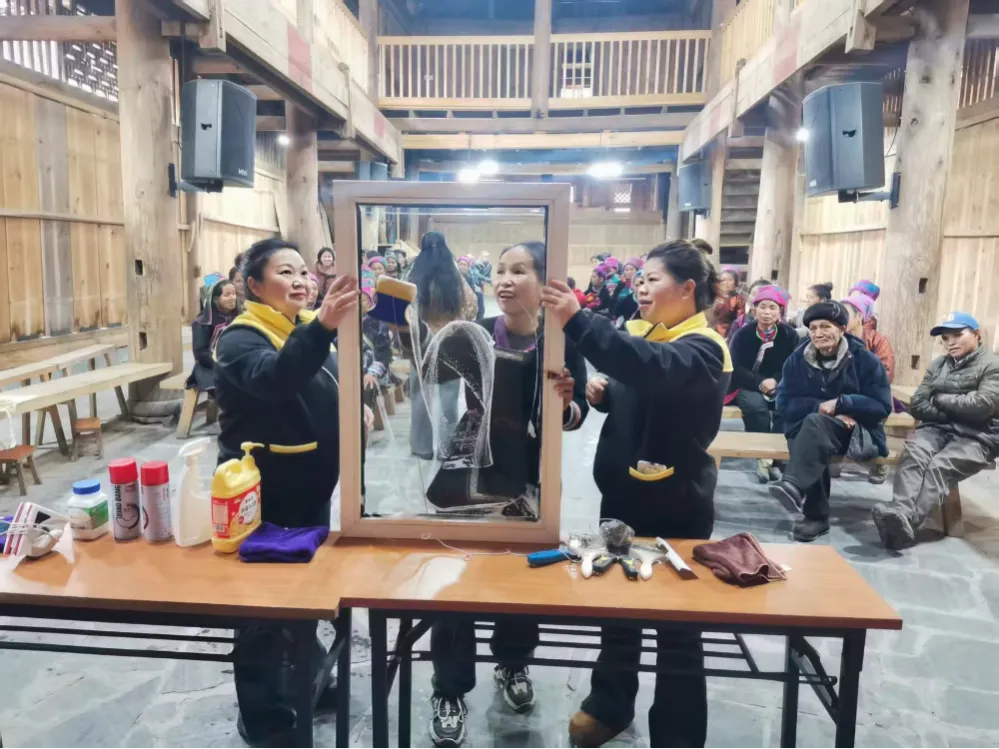 1月15日,培训在肇兴侗寨继续开展。肇兴侗寨打造4A级景区以来,在环境卫生建设改善方面下足功夫,村级妇女作为家庭卫生建设主力军,掌握家政服务基本技能,为景区建设发展助力巾帼力量。此次培训,由肇兴村妇联组织5个鼓楼妇女代表50余人参加,培训期间吸引100名妇女共同参与。培训老师根据肇兴侗寨群众居住房屋及民宿特点,向参训学员展示家政技能和收纳整理技术,除了针对“卫生家庭”建设清洁标准的培训外,还增设侗族大歌表演场地清洁课程,讲授传统服饰展示区除尘、芦笙乐器养护等特色内容,助力提升旅游服务环境。