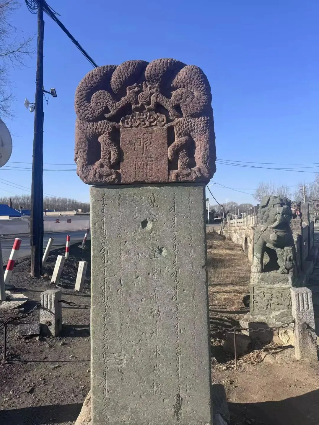 桥东侧有一块绿泥板岩石碑,碑首有浮雕蛟龙四条,石碑正面刻有“宽温仁厚皇帝敕建永安桥,大清崇德六年岁次辛巳季秋吉旦”,碑额篆刻“御建”二字。交织着300多年显赫记忆的烙印,就这样款款走来。