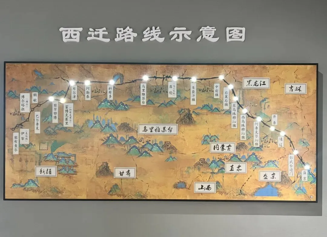 四大主题展厅展出了千余件展品,详实记录了锡伯族从起源到现在的变迁史。展厅设在二楼,参观动线清晰,通过大型景观雕塑群、民俗实景蜡像组、3D光影、半穹全景画、电子触屏、影像巡播等多种展览形式,对锡伯族起源迁徙、历史文化、万里戍边、特色民俗、现代文明等作了全景立体式展现,串联起锡伯族从远古走来的足迹,更镌刻着民族融合的动人印记。