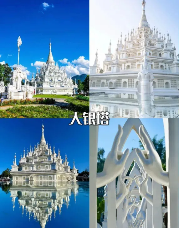 1..天空之镜拍照:银塔西侧的镜面水池是拍照的最佳机位,站在水池边,纯白的银塔与倒影完美融合,仿佛置身天空之境。建议穿浅色系衣服(白色、浅蓝、浅粉),租一套傣装拍照更有氛围(20元/小时,含头饰、披肩)。