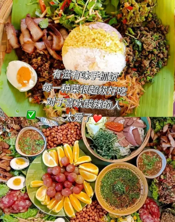 ① 傣味手抓饭:芒市的招牌美食,一个巨大的竹簸箕里,装满了米饭、烤鸡、烤鱼、烤肉、凉拌菜等,荤素搭配,种类丰富。适合多人一起吃,用手抓着吃,很有傣家风情。推荐圣亚庄园、梦幻德宏的手抓饭,人均50元左右。