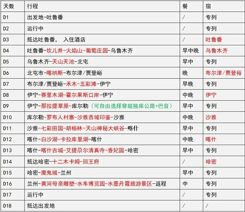 哈密(大海道、回王府、十二木卡姆)/乌鲁木齐 (天山天池)/吐鲁番 (坎儿井、火焰山、葡萄庄园)/北屯(喀纳斯、禾木、五彩滩)/博州 (赛里木湖) /伊宁 (霍尔果斯口岸、那拉提) /库尔勒(罗布人村寨)/库车 (天山神秘大峡谷)/沙雅(沙雅胡杨林、七彩田园、西域印鉴)/阿图什(白沙山、卡拉库勒湖)/喀什(喀什老城、艾提尕尔清真寺、香妃园) /兰州(黄河母亲雕塑、水车博览园、水墨丹霞)南北疆空调专列18日(注意:兰州段行程已含。独家安排沙雅段行程并入住当地酒店1晚。另可自由选择穿越独库公路中南段+巴音布鲁克)