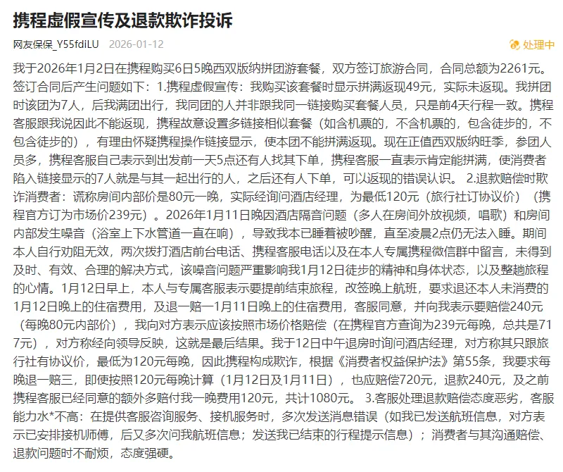 携程旅游虚假宣传及退款欺诈投诉