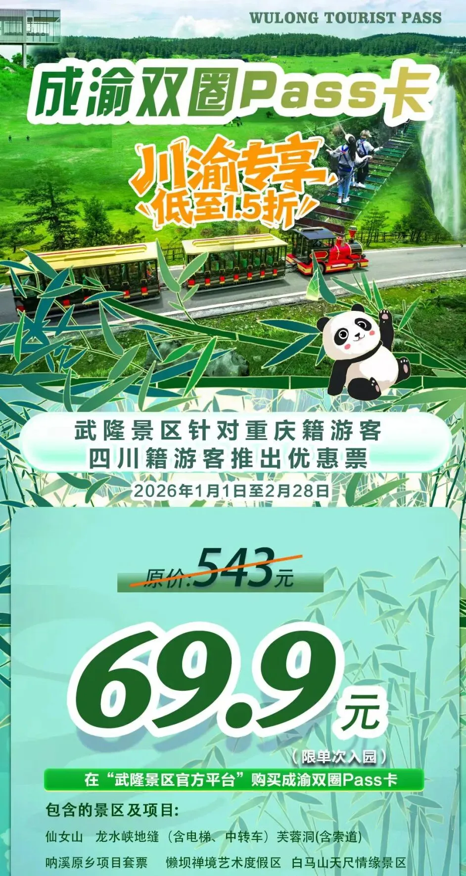 即日起至2月28日,武隆景区面向重庆籍、四川籍游客特别推出“成渝双圈Pass卡”:原价543元的仙女山、芙蓉洞(含索道)、龙水峡地缝(含电梯、中转车)、白马山天尺情缘景区、懒坝禅境艺术度假区、呐溪原乡六大景区及项目套票,现仅需69.9元。