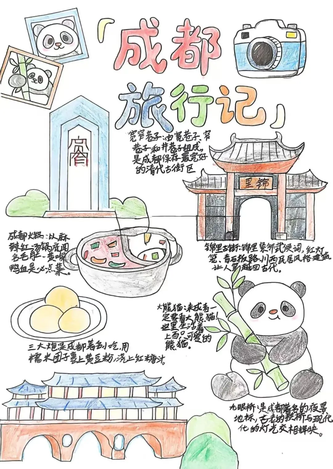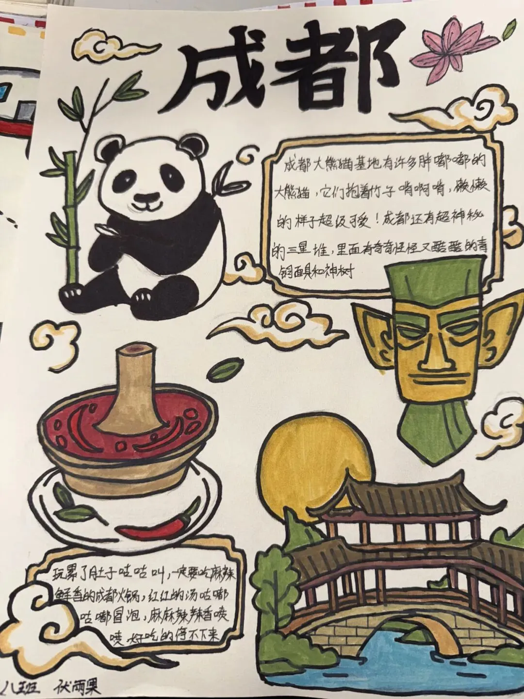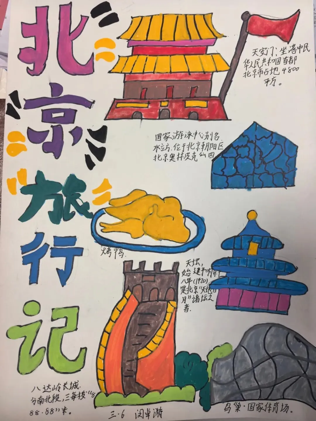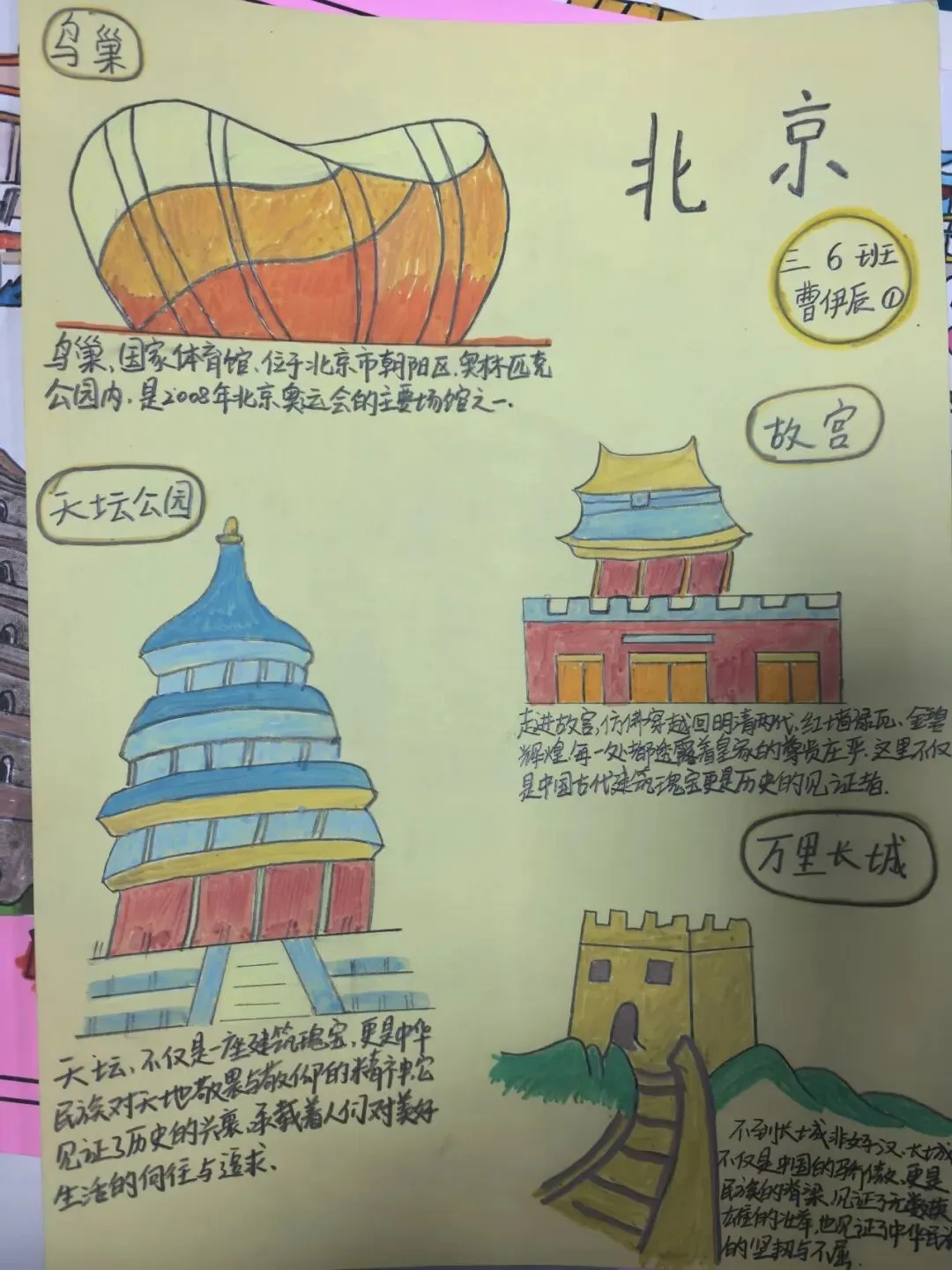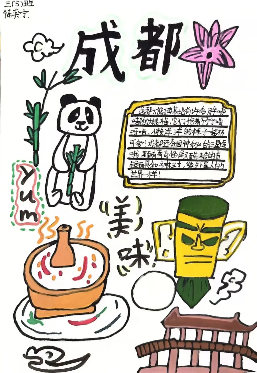 活动中,三年级孩子以“城市旅行手记”为载体,将语文学习与地域文化探索深度融合。大家选取大连、西安、杭州、北京、成都等各具特色的城市,用手抄报的形式展现旅行见闻:有的以照片拼贴和手绘路线,还原大连星海广场、跨海大桥的海滨风光;有的用细腻的文字介绍西安兵马俑、大雁塔的历史底蕴,描绘杭州雷峰塔与西湖的诗意景致;还有的聚焦北京故宫、长城的雄伟,或是成都熊猫基地的可爱与火锅的鲜香,将城市的特色建筑、美食、民俗一一呈现。