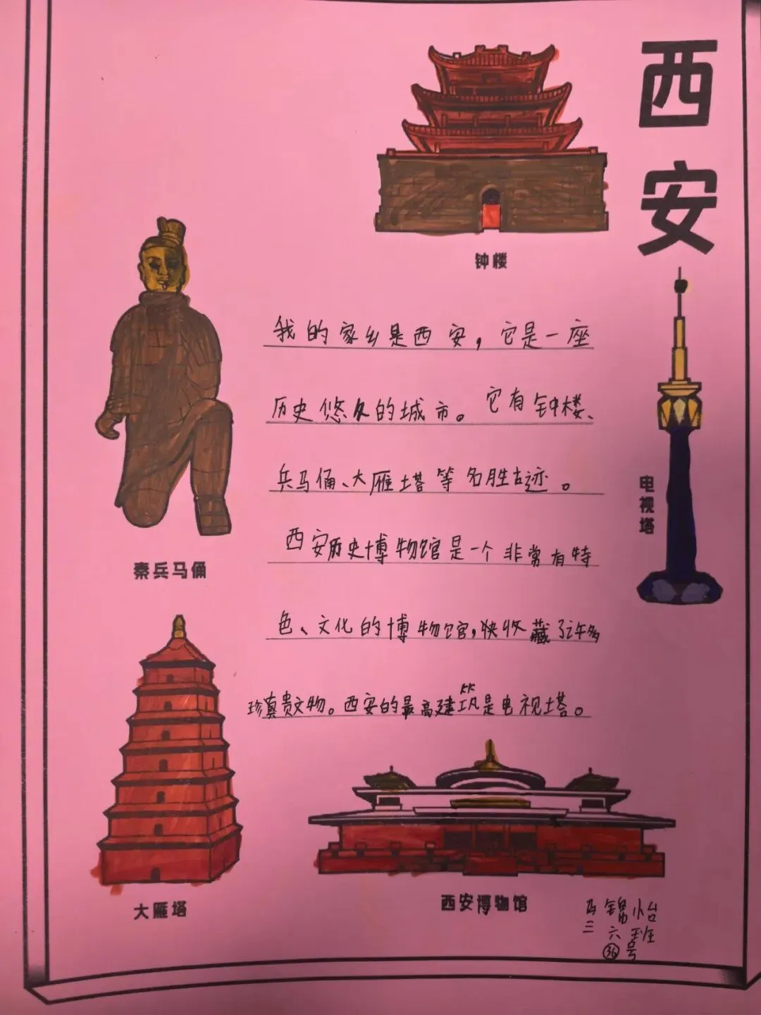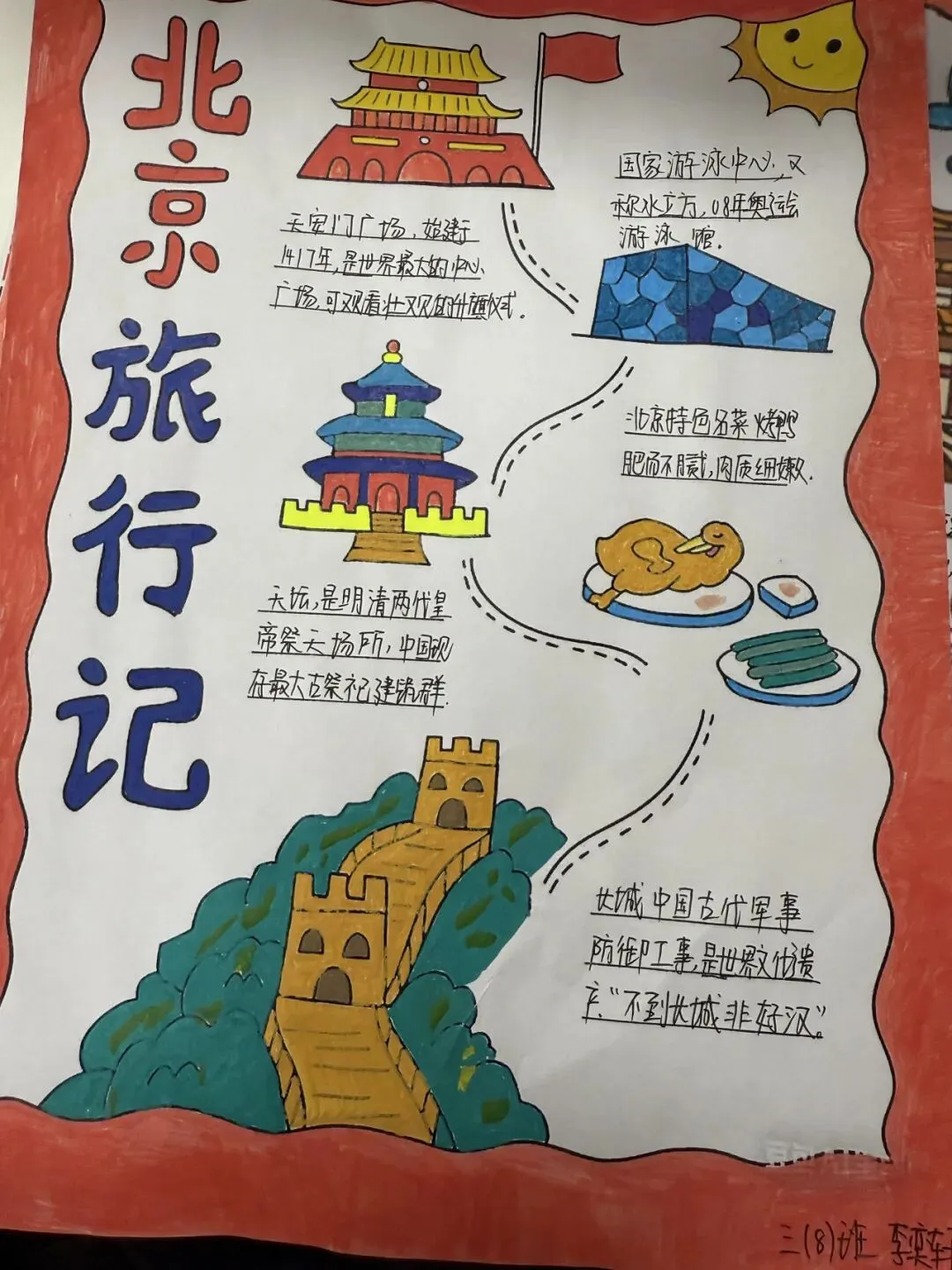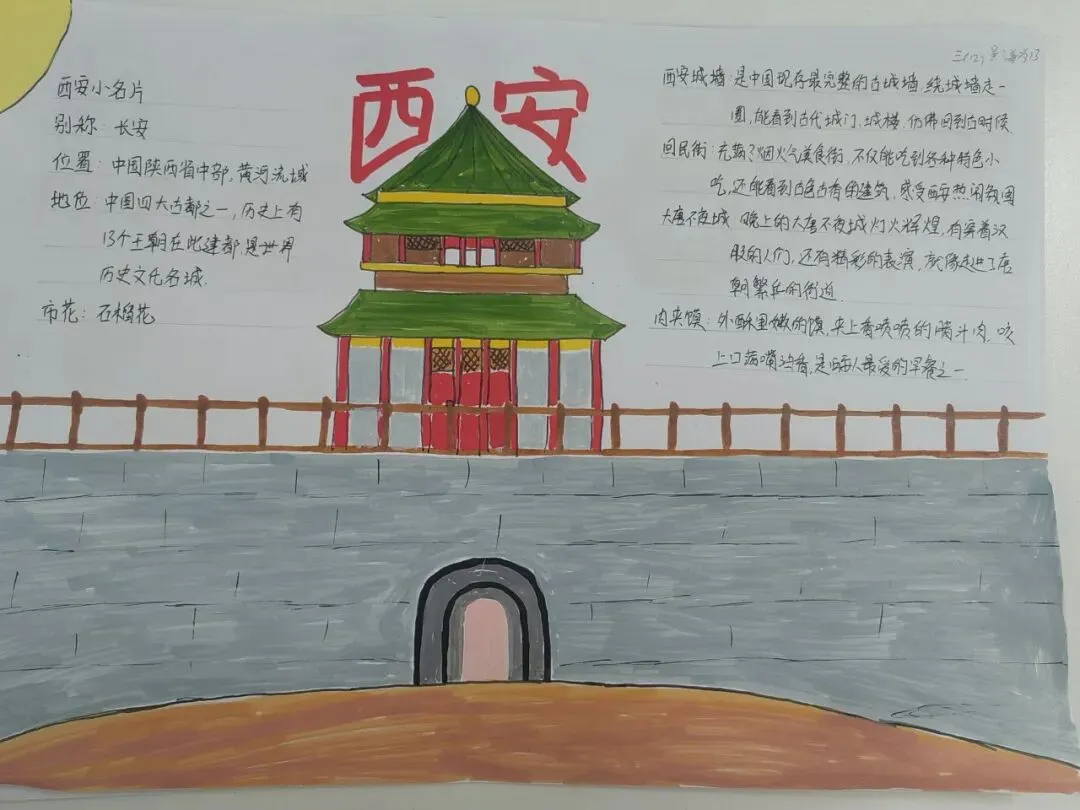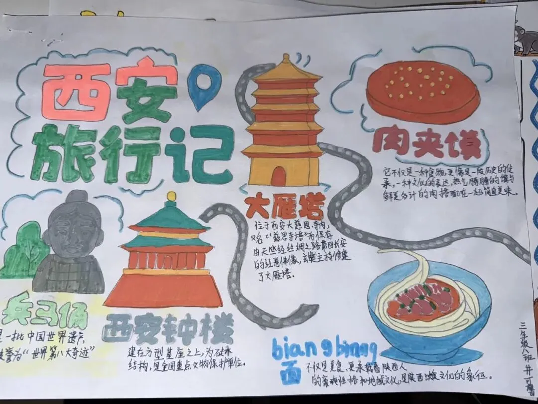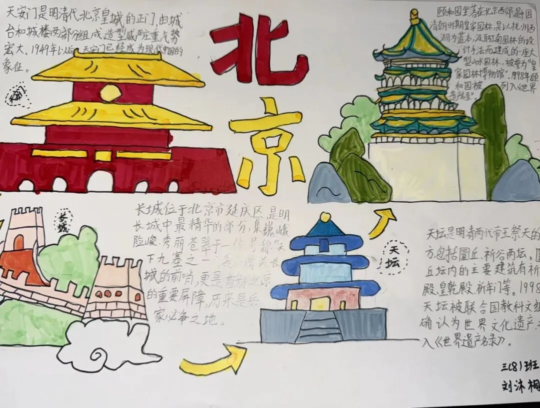 活动中,三年级孩子以“城市旅行手记”为载体,将语文学习与地域文化探索深度融合。大家选取大连、西安、杭州、北京、成都等各具特色的城市,用手抄报的形式展现旅行见闻:有的以照片拼贴和手绘路线,还原大连星海广场、跨海大桥的海滨风光;有的用细腻的文字介绍西安兵马俑、大雁塔的历史底蕴,描绘杭州雷峰塔与西湖的诗意景致;还有的聚焦北京故宫、长城的雄伟,或是成都熊猫基地的可爱与火锅的鲜香,将城市的特色建筑、美食、民俗一一呈现。
