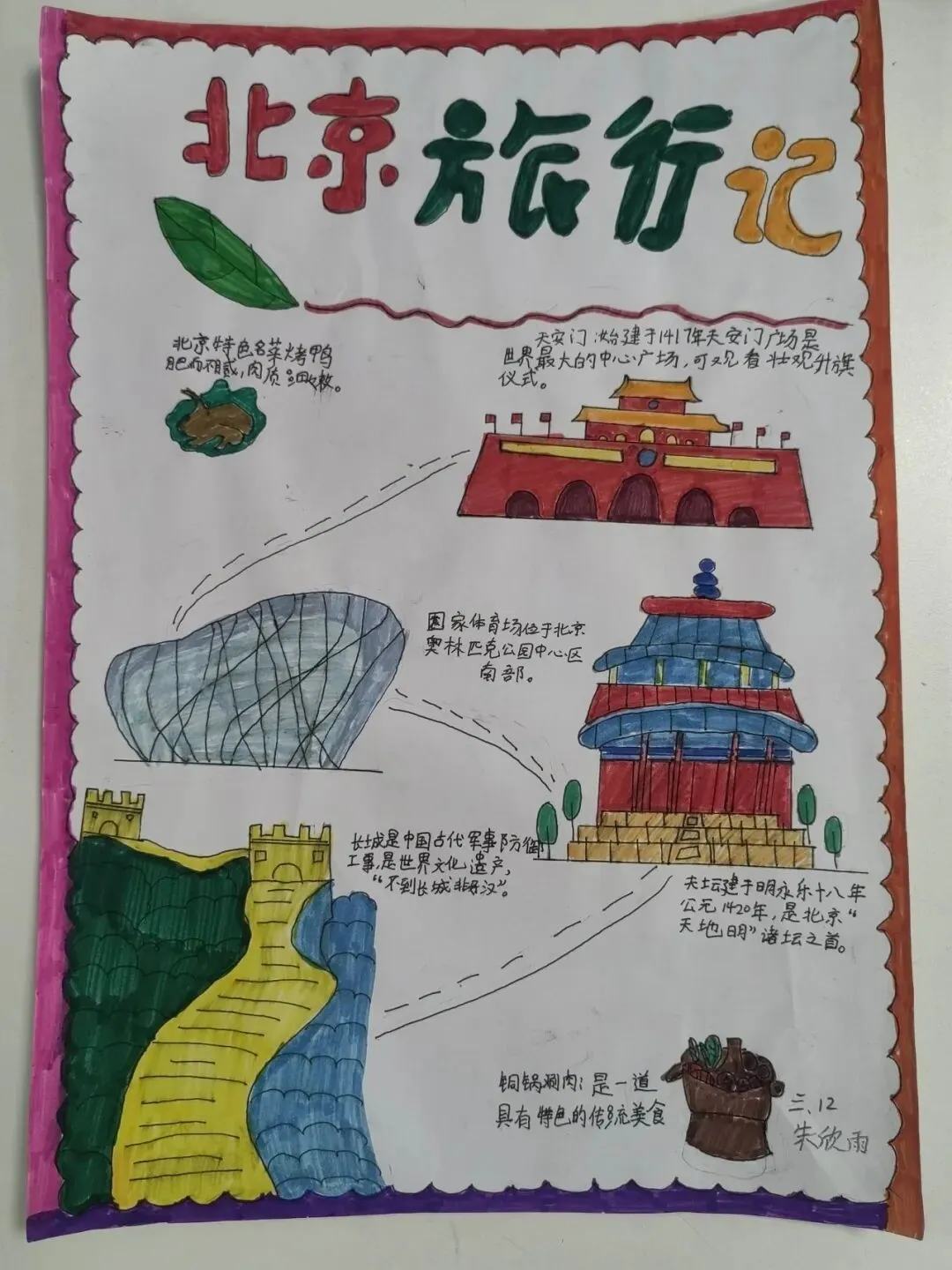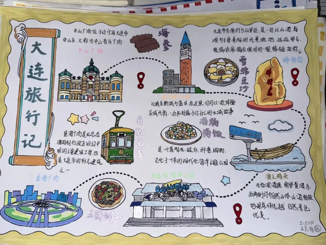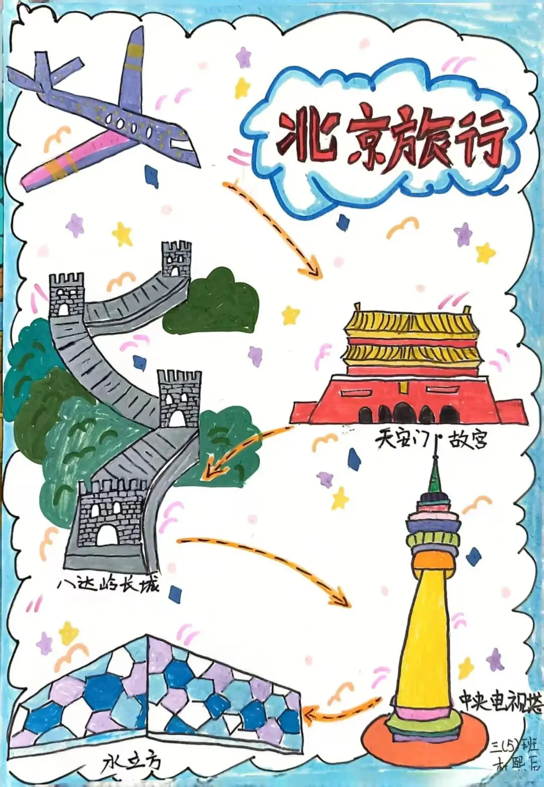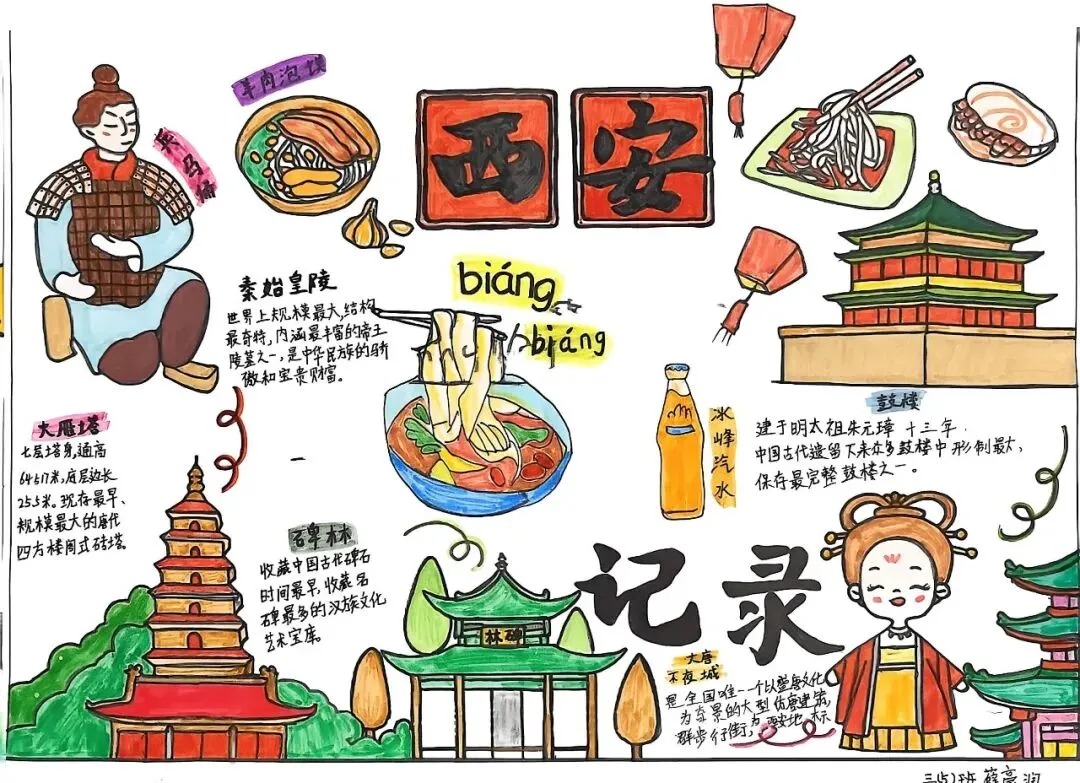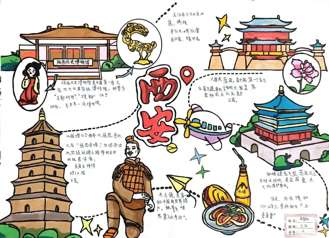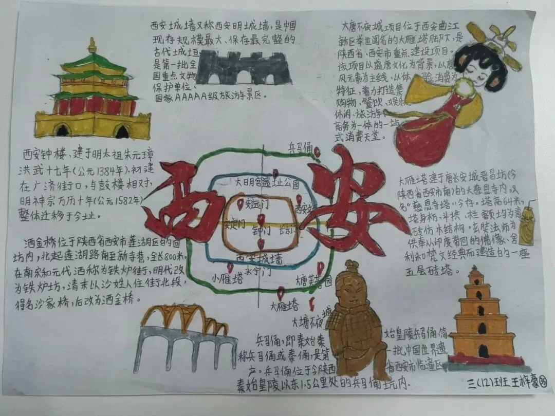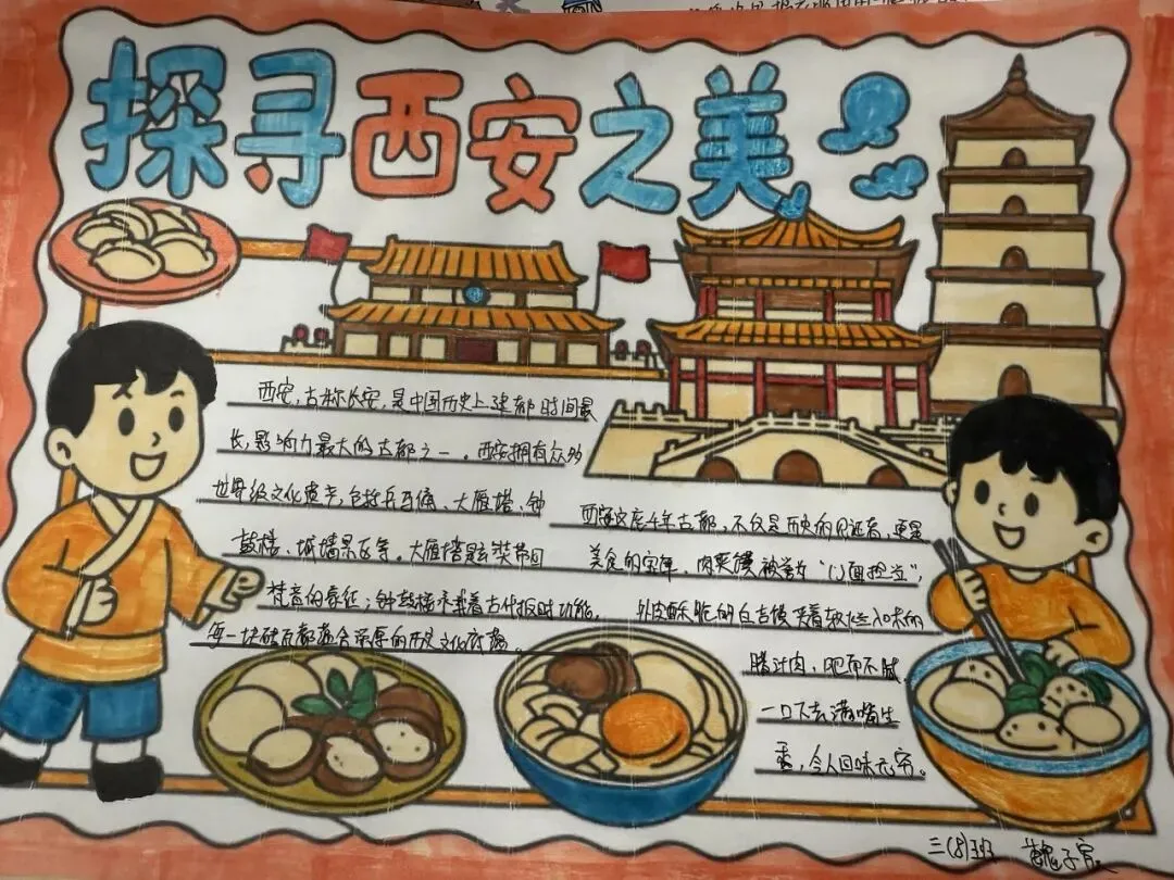 活动中,三年级孩子以“城市旅行手记”为载体,将语文学习与地域文化探索深度融合。大家选取大连、西安、杭州、北京、成都等各具特色的城市,用手抄报的形式展现旅行见闻:有的以照片拼贴和手绘路线,还原大连星海广场、跨海大桥的海滨风光;有的用细腻的文字介绍西安兵马俑、大雁塔的历史底蕴,描绘杭州雷峰塔与西湖的诗意景致;还有的聚焦北京故宫、长城的雄伟,或是成都熊猫基地的可爱与火锅的鲜香,将城市的特色建筑、美食、民俗一一呈现。