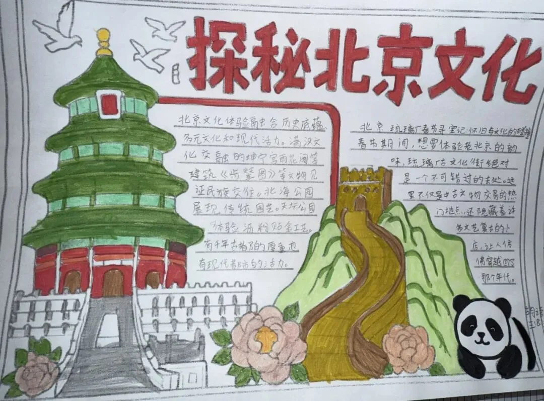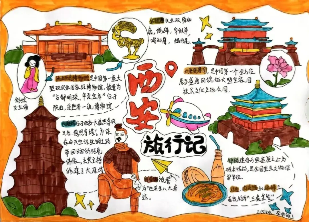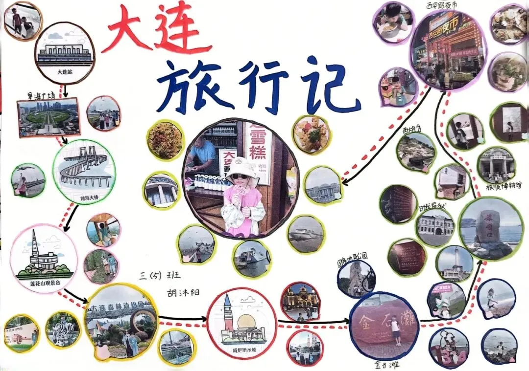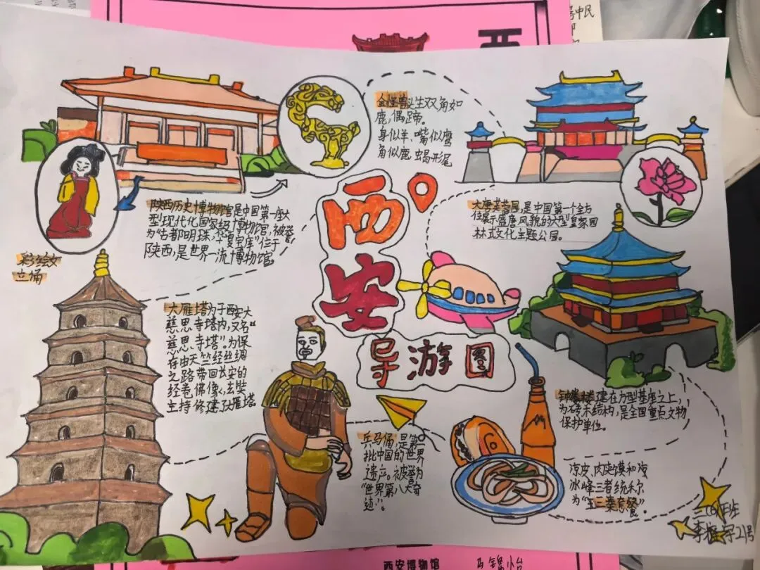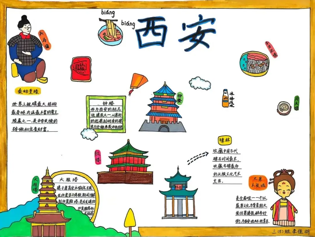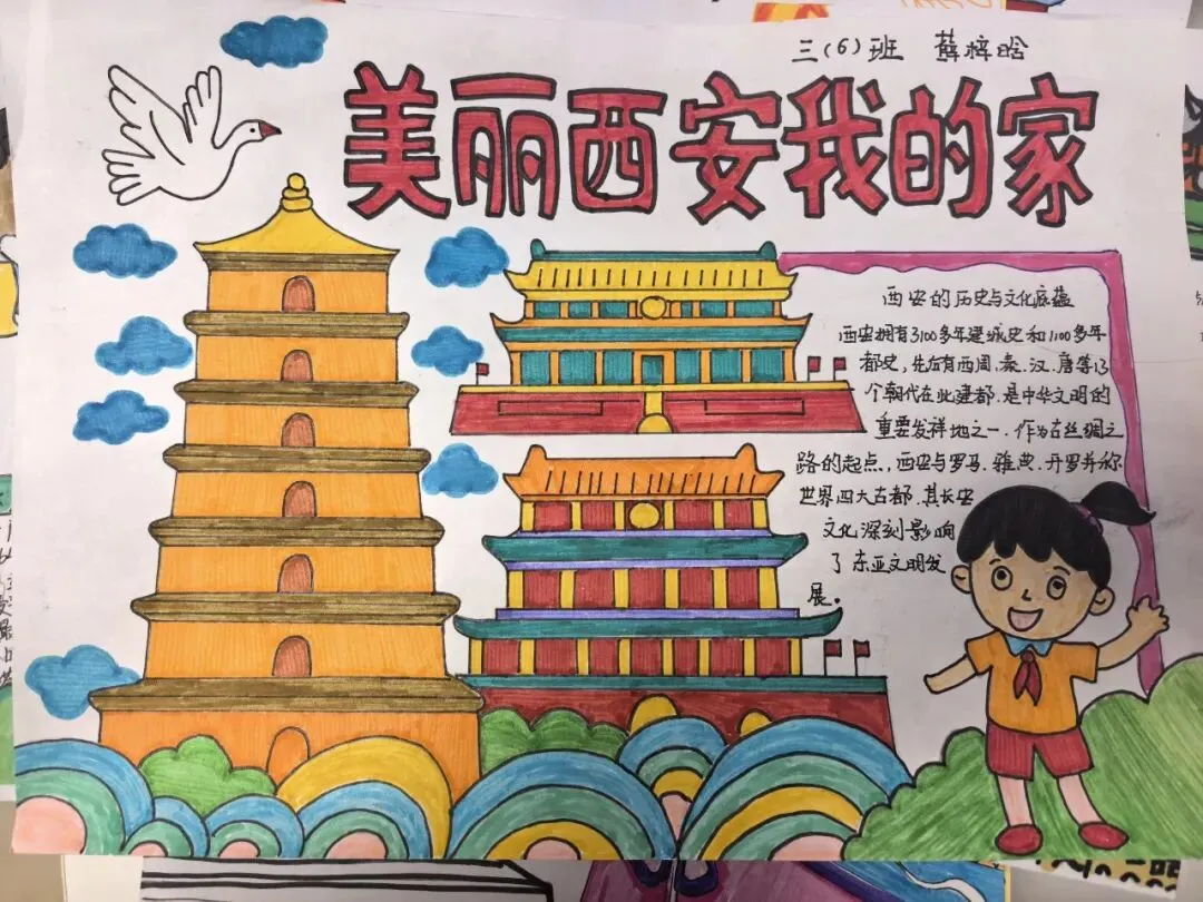 活动中,三年级孩子以“城市旅行手记”为载体,将语文学习与地域文化探索深度融合。大家选取大连、西安、杭州、北京、成都等各具特色的城市,用手抄报的形式展现旅行见闻:有的以照片拼贴和手绘路线,还原大连星海广场、跨海大桥的海滨风光;有的用细腻的文字介绍西安兵马俑、大雁塔的历史底蕴,描绘杭州雷峰塔与西湖的诗意景致;还有的聚焦北京故宫、长城的雄伟,或是成都熊猫基地的可爱与火锅的鲜香,将城市的特色建筑、美食、民俗一一呈现。