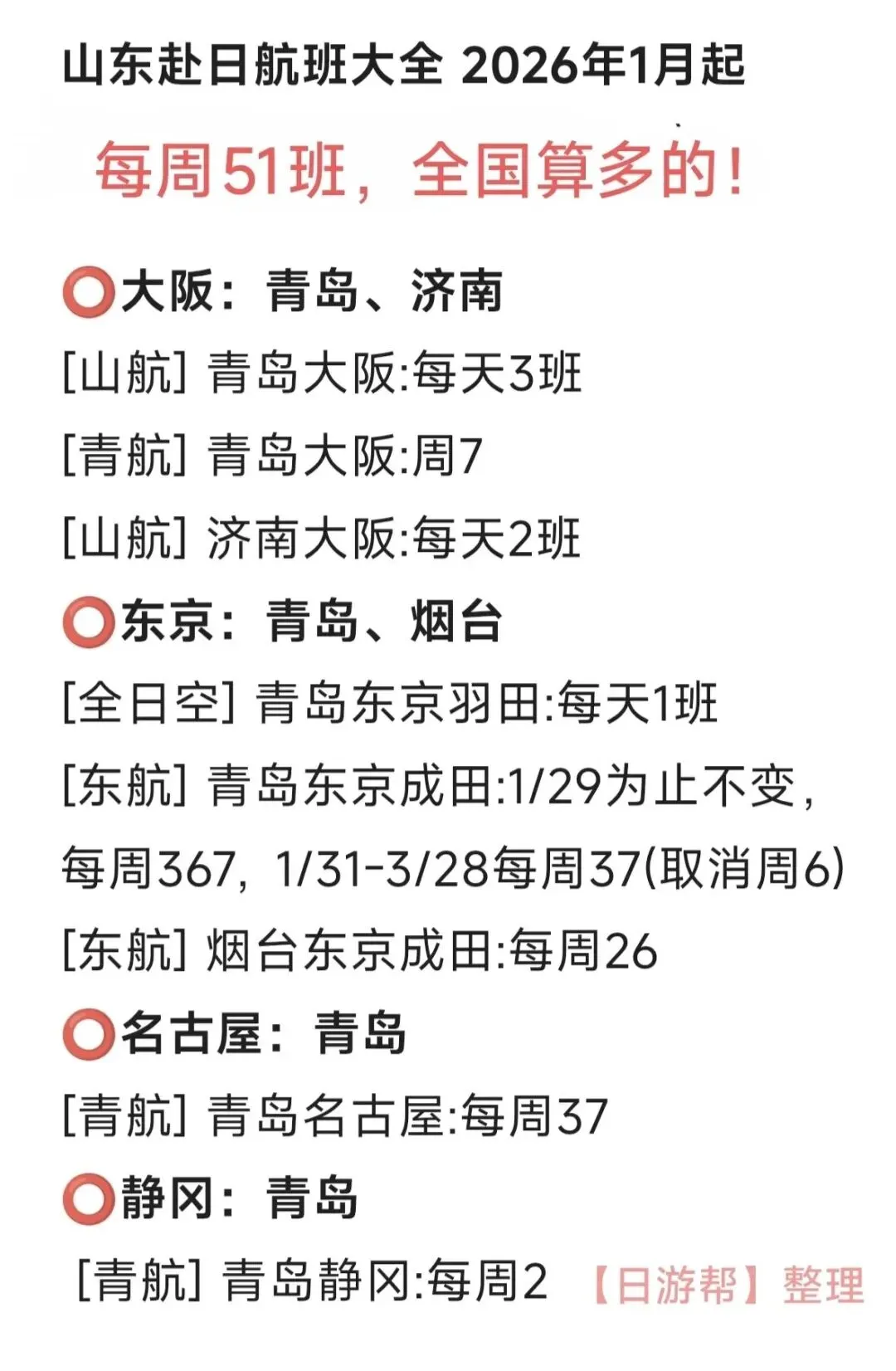 注:若需确保出行,建议山航大阪(青岛2班,济南1班)、全日空东京(每天一班必飞)。