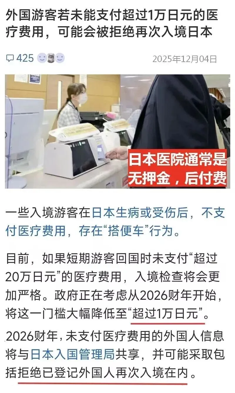 ⭕️ 保险:日本医院是后付费,近些年屡屡发生外国游客因医疗费太贵而逃单现象。2026年4月起日本将整治医疗逃单。今后发生逃单,禁止入境门槛由20万日元下调到1万!因此建议加出境游意外险,几十元买个放心。除了意外事故,也对应急病门诊及住院。国内、日本保险公司的皆可。