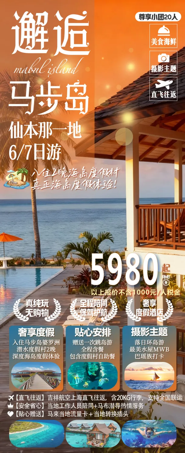 据了解,此次首航团的游客们将在旅游圈的安排下,开启为期7天5晚的仙本那深度之旅。行程涵盖了马布岛婆罗潜水度假村2晚住宿、马达京三岛浮潜、明星同款MWB水屋参观打卡等经典项目,更有独家安排的落日环岛、原住民文化体验等精彩活动。游客们不仅能领略仙本那绝美的海岛风光,还能深入了解当地的风土人情。