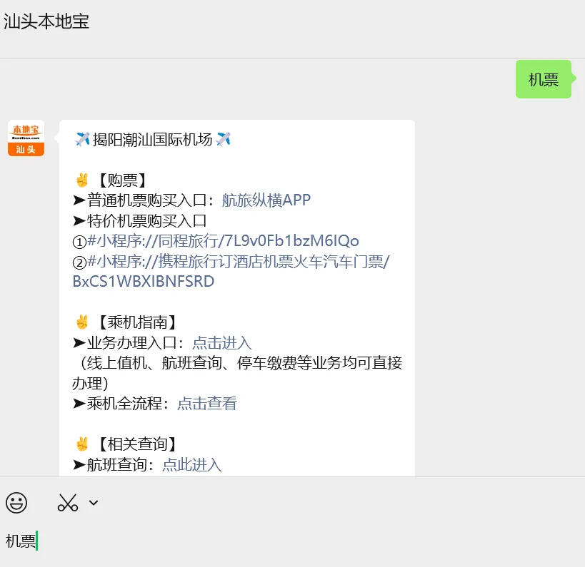 长按下方二维码识别并关注公众号【汕头本地宝】聊天对话框回复【机票】或【高铁】即可获取机票、高铁票购买入口。