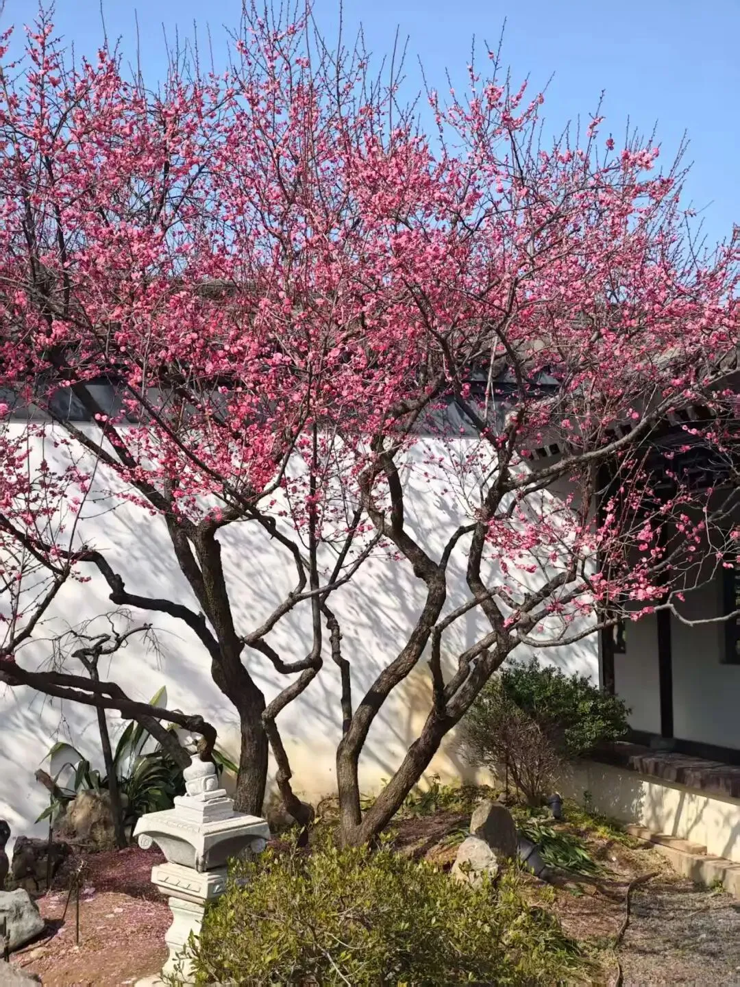 墨池品梅往前,路过梅妻鹤子雕像,经过梅花观止,前面就是梅园的“镇园之宝”所在地—古梅园。园中保存着一株树龄达800余年的梅祖宗,苍劲的枝干如铁骨龙鳞,诉说着岁月的沧桑。这株古梅不仅是活的文物,更是生命力的象征。