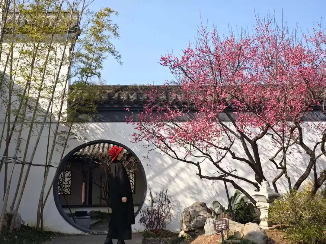 梅花品种资源圃旁,依水而建的是墨池品梅。“墨池”之名,取自王冕《墨梅》诗意。这里以一方静谧的圆形水池为核心,池畔点缀着数株老梅,枝干虬劲,倒影入池,不用笔墨,就是一幅天然的水墨画。池边梅花门洞墙上题有王冕《墨梅》诗词,将视觉的“赏”与精神的“品”完美结合。