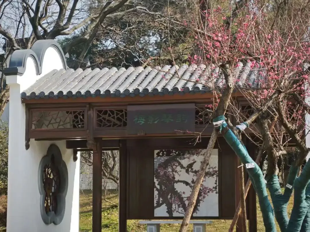 放鹤亭左前方,是梅园“新十景”之一梅影琴韵,将听觉的“乐”融入视觉的“景”。平台周围梅树环绕,微风拂过,梅枝轻摇,仿佛在演奏一曲自然的乐章。
