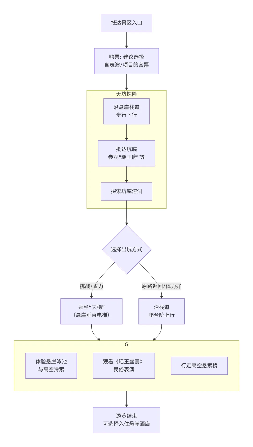 确认核心特色:棉花天坑并非一个单纯的观景坑,而是一个集天坑奇观、悬崖酒店、民俗表演、刺激体验于一体的综合旅游度假区。它的核心亮点是 “坑中建城” 的独特设计。