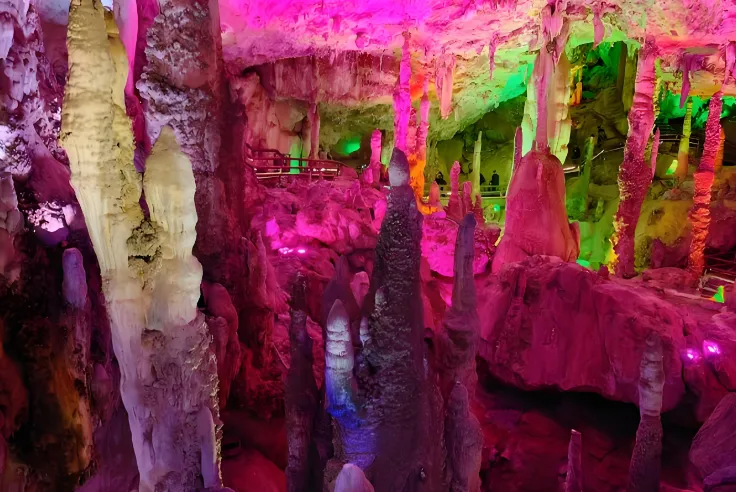 第六站:水波洞喜欢探险的朋友看过来。这是一个形成了两千万年的喀斯特溶洞,全长6000多米,现在开发了1500米。洞里分旱洞、水洞,还有传说中的白龙和神龟斗法的故事。冬暖夏凉,平均15度,进去得穿件薄外套。最大的厅有800多平米,像个地下宫殿,配合灯光效果,神秘感十足。