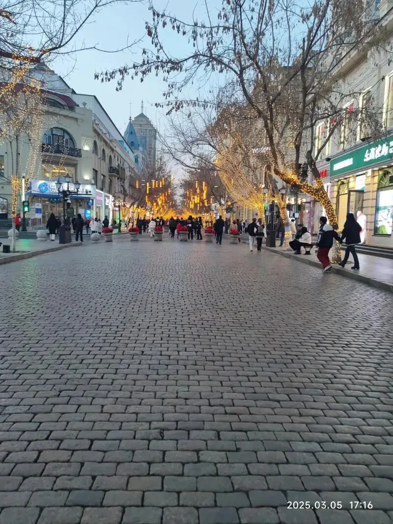 中央大街石板路一脚下去就清脆,门脸一排都是老式花样。