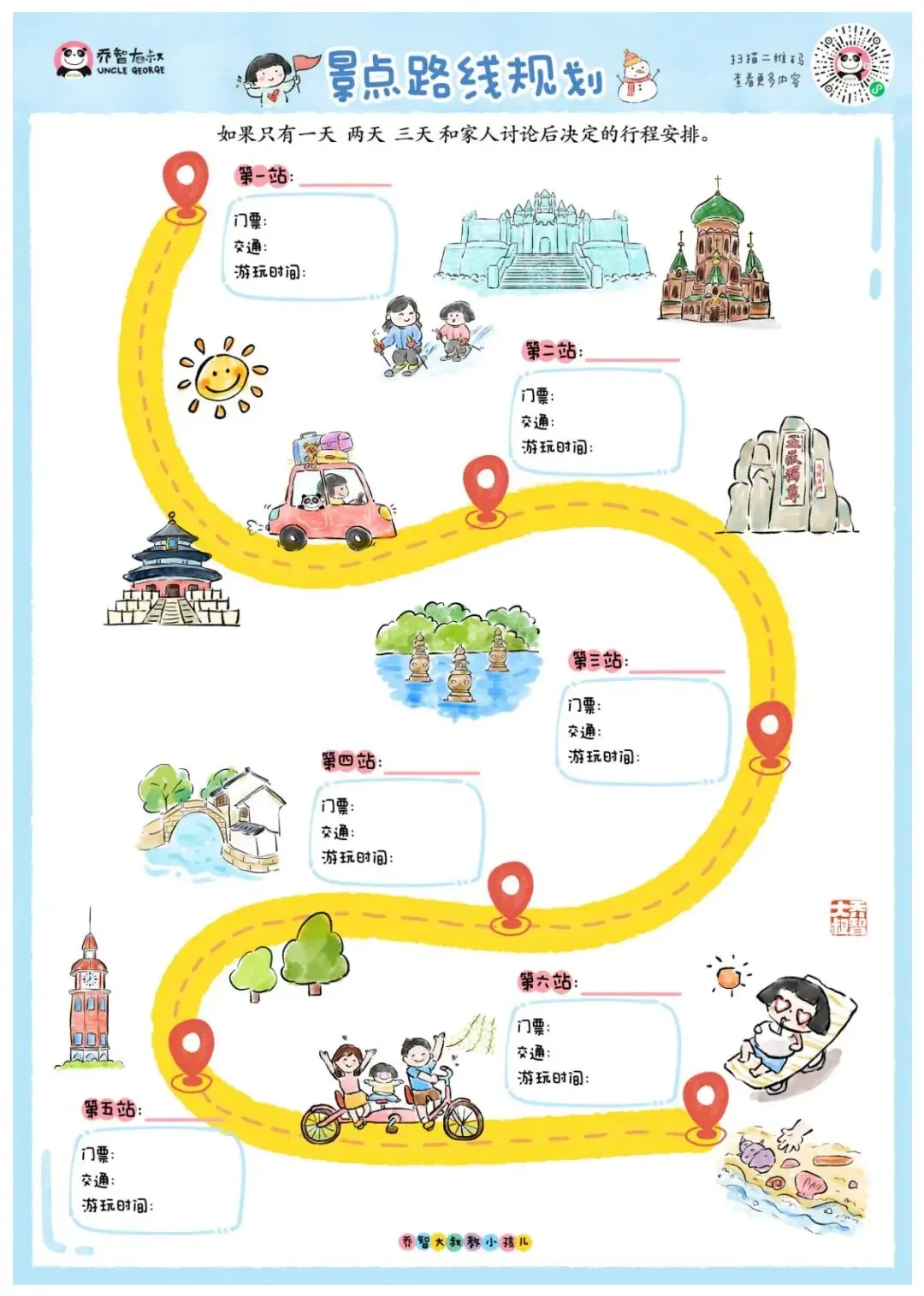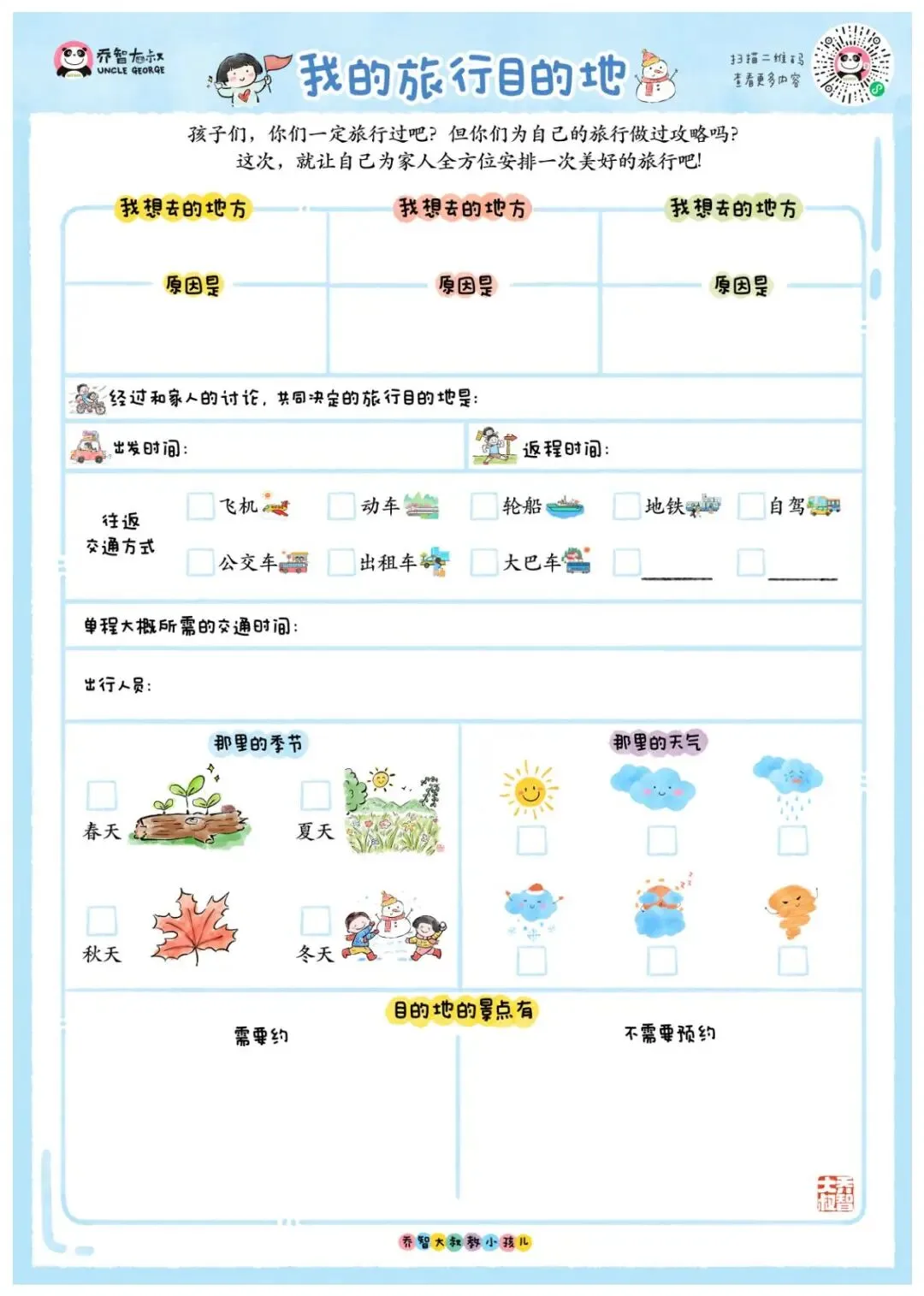 我还在手册里 加了亲子旅行地推荐 按孩子的年龄分类 0-2岁适合休闲度假 3-6岁适合探索体验 家长不用再纠结去哪玩 — 后记 — 这本手册 不只是一本攻略 更是孩子成长的小脚印 等他长大再翻开 会记得小时候 和爸爸妈妈旅行的时光 记得自己第一次 规划行程的认真 记得那些简单的快乐 这个寒假 带上这本手册 带孩子去看看冬天的世界吧 让他做旅行的小主人 也让亲子时光 添加更多的美好回忆