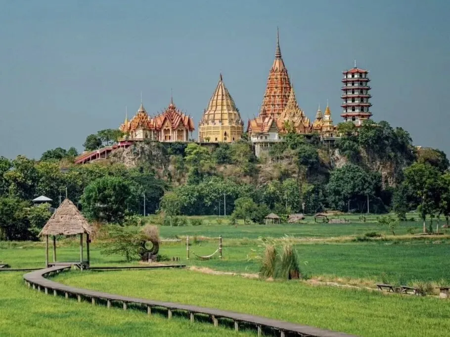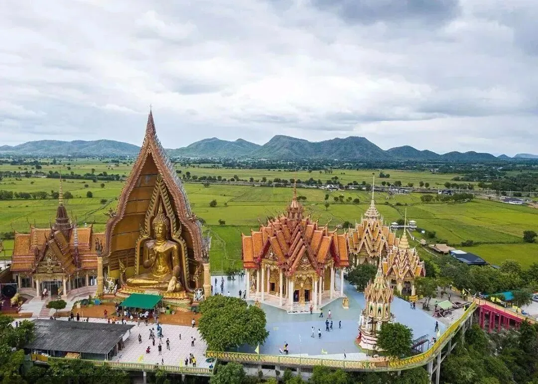 虎穴寺(Wat Tham Sua)是泰国十大最美寺庙之一,也是北碧最大坐佛的寺庙,建在一座六百多米的山顶上。寺内最让人惊叹的是建于1937年时的一座高达18米的金色佛像。从入口处到山顶可以攀阶梯而上,顶端可远眺迷人的北碧稻田美景。