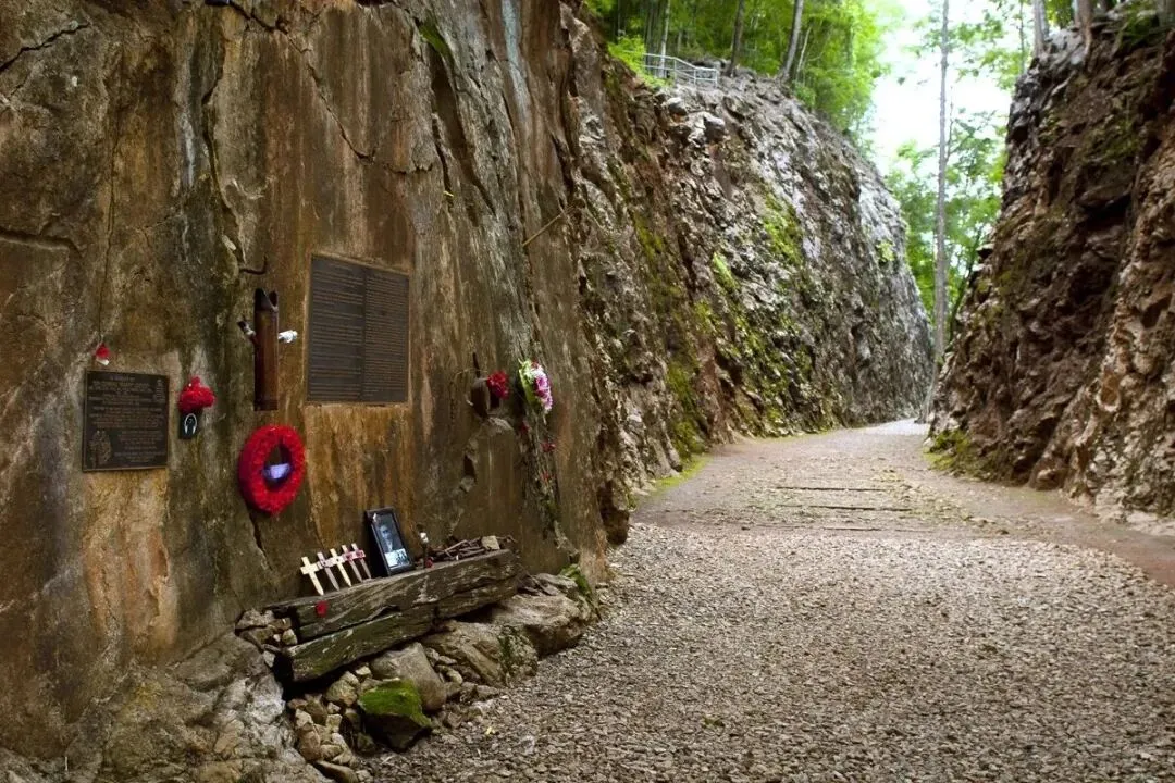 现在,这里是一座天然的纪念馆,摆放着褪色的国旗、照片和鲜花,以纪念那些曾在此生活,艰苦劳作的军人。