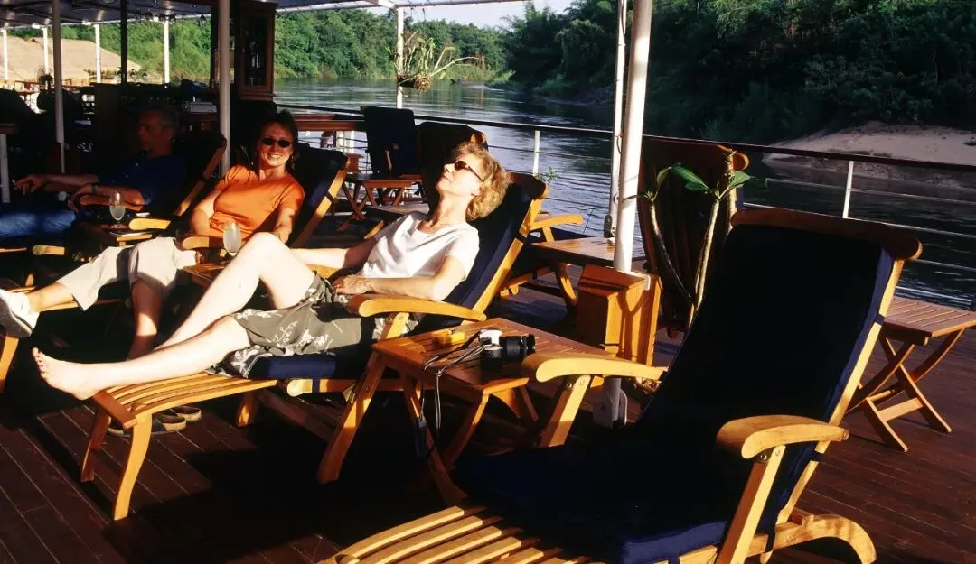 与大型游轮追求规模和效率不同,他希望创造一种“无需频繁打包行李,就能深入小众秘境”的旅行方式,于是亲自参与设计,打造了这艘小巧而温馨的船只,将19世纪复古风格的浪漫与现代奢华元素巧妙结合,以小体量、高品质的方式,深入桂河流域最核心、也最难抵达的地段。