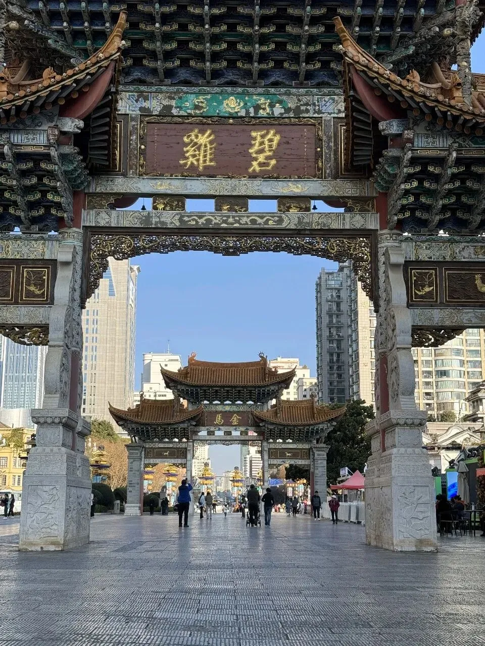 南屏街是昆明老街的一部分,标志性建筑就是金马、碧鸡坊。