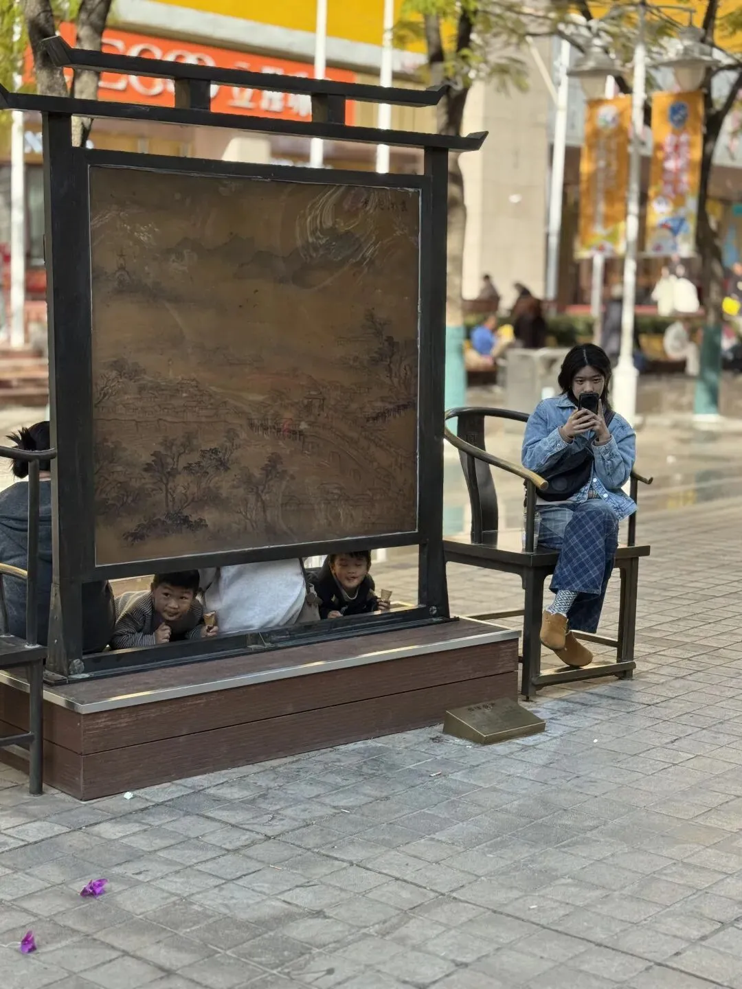 在南屏街还有两个有特色的景点,一是古铜色的雕像,栩栩如生,男子挑担休息的长啸,女子走路时的安详,再配上明清时期的太师椅,组成了一幅人生百态图。另一个就是公交记忆场景,记录民国到现在的公交车的变迁史,从公交的更迭,展示了社会科技的演变和发展。
