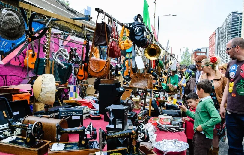市集: Brick Lane Market 地址: 91 Brick Lane, E1 6QR 时间: 每周日早上10点至下午5点 (周日最佳时间) 东伦敦的Brick Lane 很棒,人尽皆知。但到了星期天,这条繁华的街道变成了一个巨大的市场,每个角落都有宝藏。老杜鲁门啤酒厂Old Truman Brewery有复古时装、艺术和手工艺品以及其他奇特事物,而附近的 Boiler House 则成为国际美食场所。这里还有一个叫做 The Tea Rooms 的古董市场,可以在这里消磨几个小时,Brick Lane Market已算是一大观光景点了。