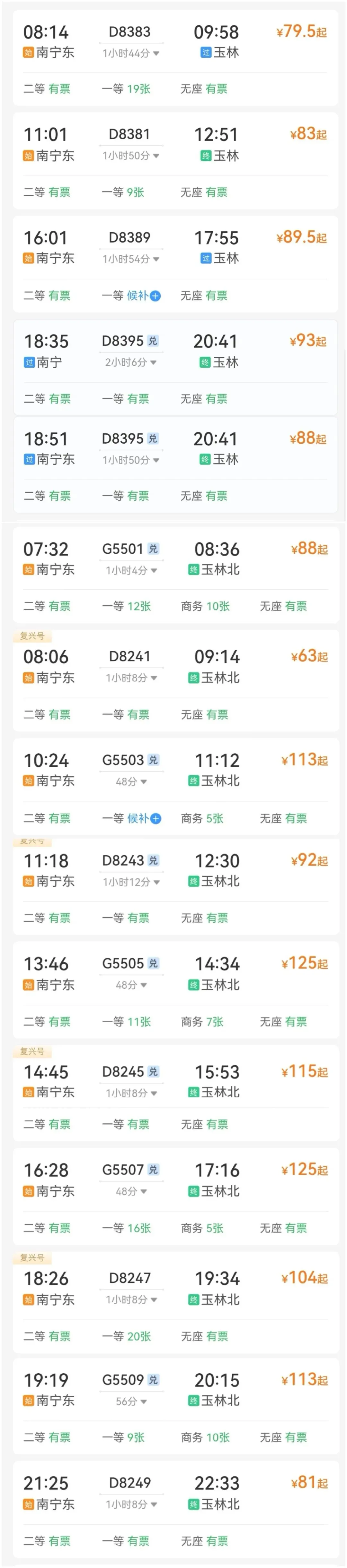 🚅从南宁出发乘坐动车直达玉林,南宁每日有多趟列车可到玉林。