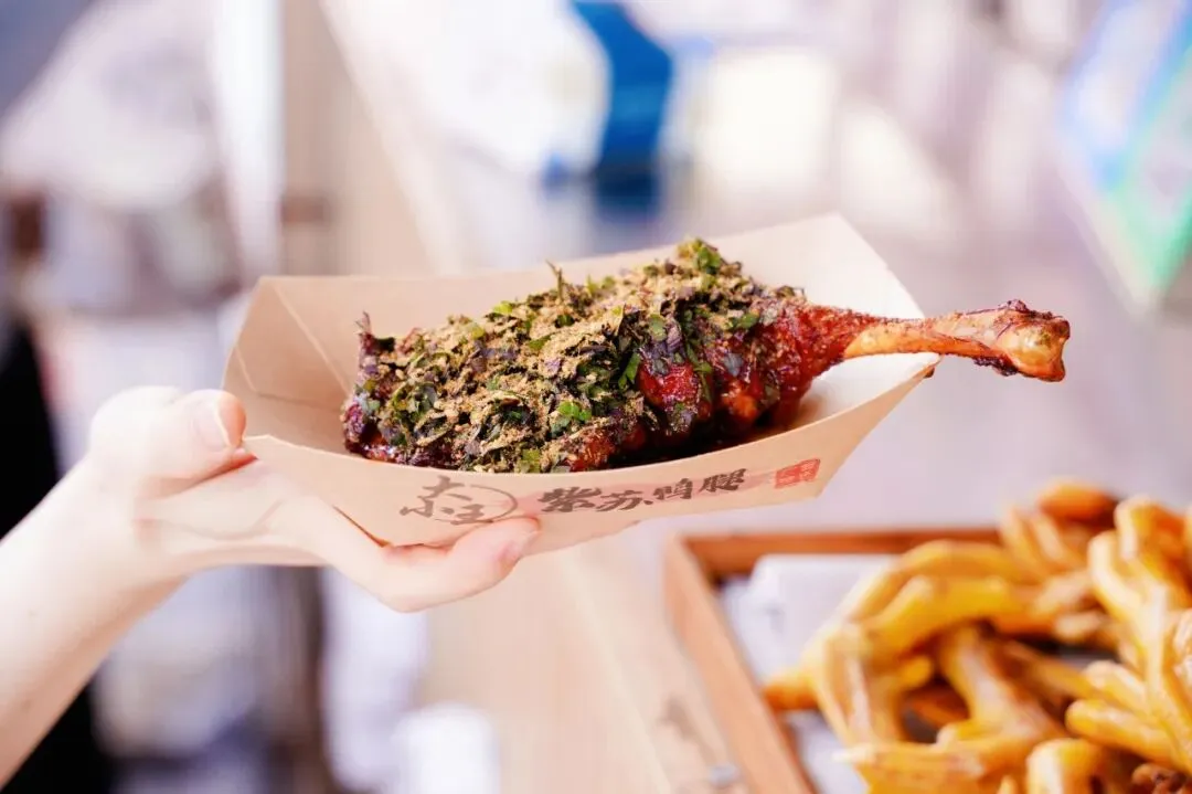 紫苏鸭腿店将传统卤味与油炸工艺结合,打造出十字街的 “爆款新味”。紫苏鸭腿咸香中带着一丝草本清香,不油不腻,一口下去满是满足感,已成为年轻人喜爱的 “新宠”。