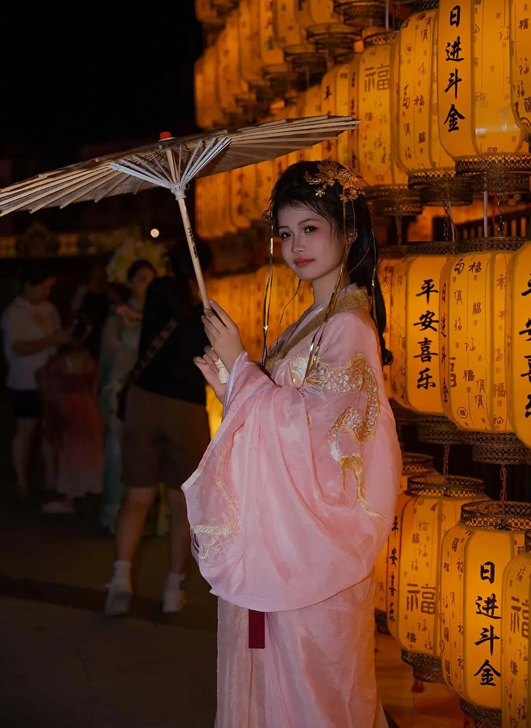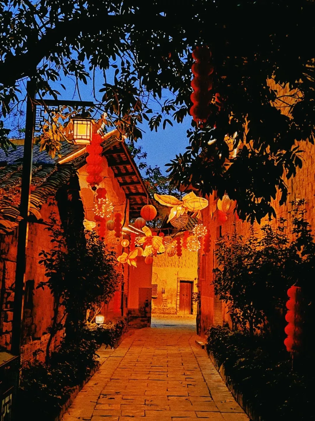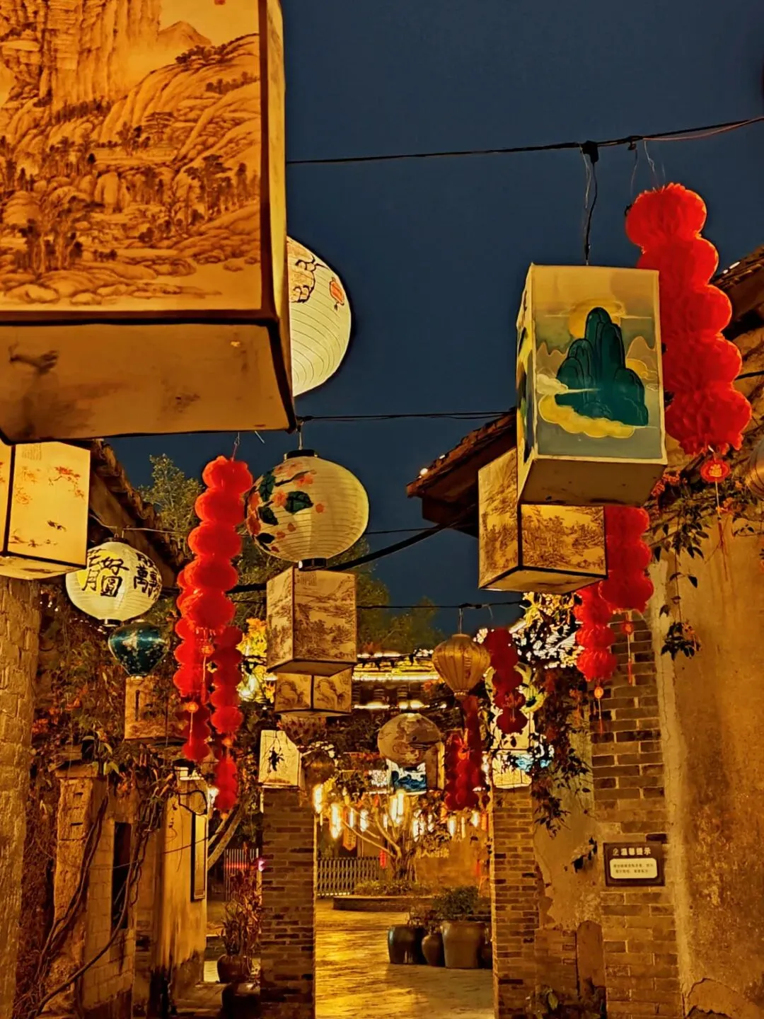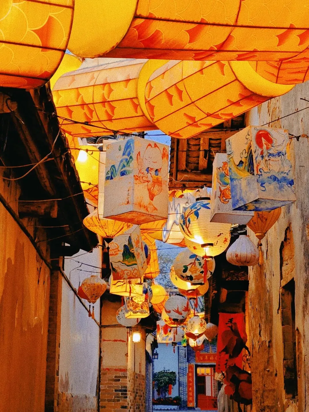 从走廊到广场,漫天都是灯笼和星星灯,像一条光之河。
