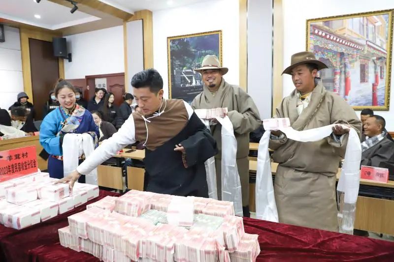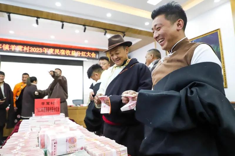 1月31日上午,在四川省阿坝州黑水县羊茸村,正举行着民宿收益分红大会,村民们翘首以盼围坐在一起,个个脸上洋溢着灿烂的笑容,等待村集体经济给他们带来的“大红包”。2023年,羊茸村乡村旅游产业回暖升温,民宿接待总收入超过800万元,创历史新高,户均分红超过12万元,客房服务人均劳务收入达到1.8万元。