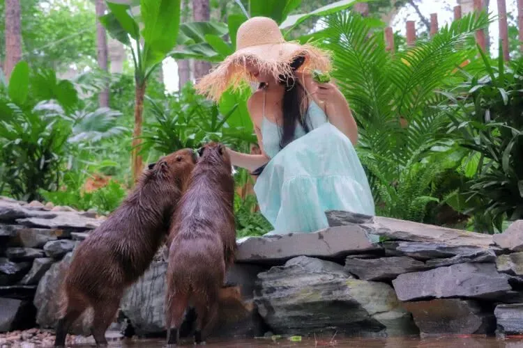 在这不仅能撸到卡皮巴拉,还能和各种小动物贴贴哦!魔法黑森林、天鹅湖鸭鸭湖以及森林牧场提供了更多亲近大自然的机会,让大家逃离城市的喧嚣,彻底将身心融入自然;可以亲手喂食小鹿、天鹅和其他小动物(投喂需自费),感受那份纯真与美好!