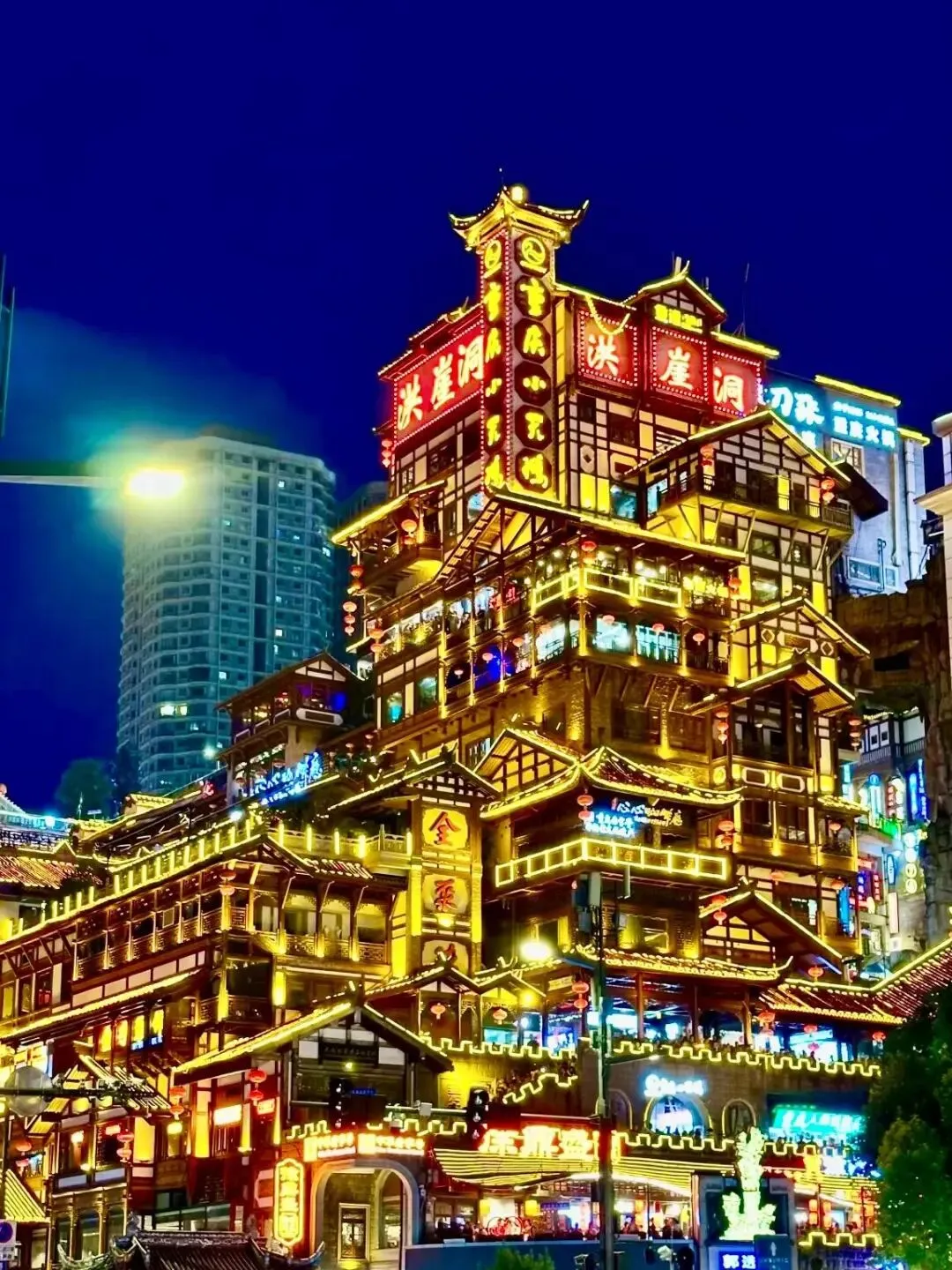别挤洪崖洞里面,直接去1楼马路对面,能看到洪崖洞的全景!灯火通明的吊脚楼层层叠叠,像现实版的千与千寻,美到失语!