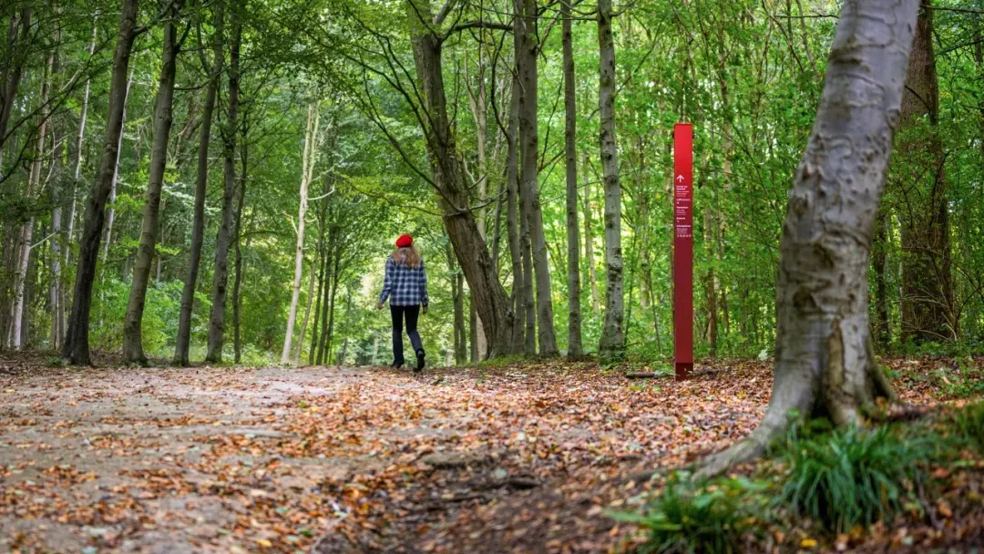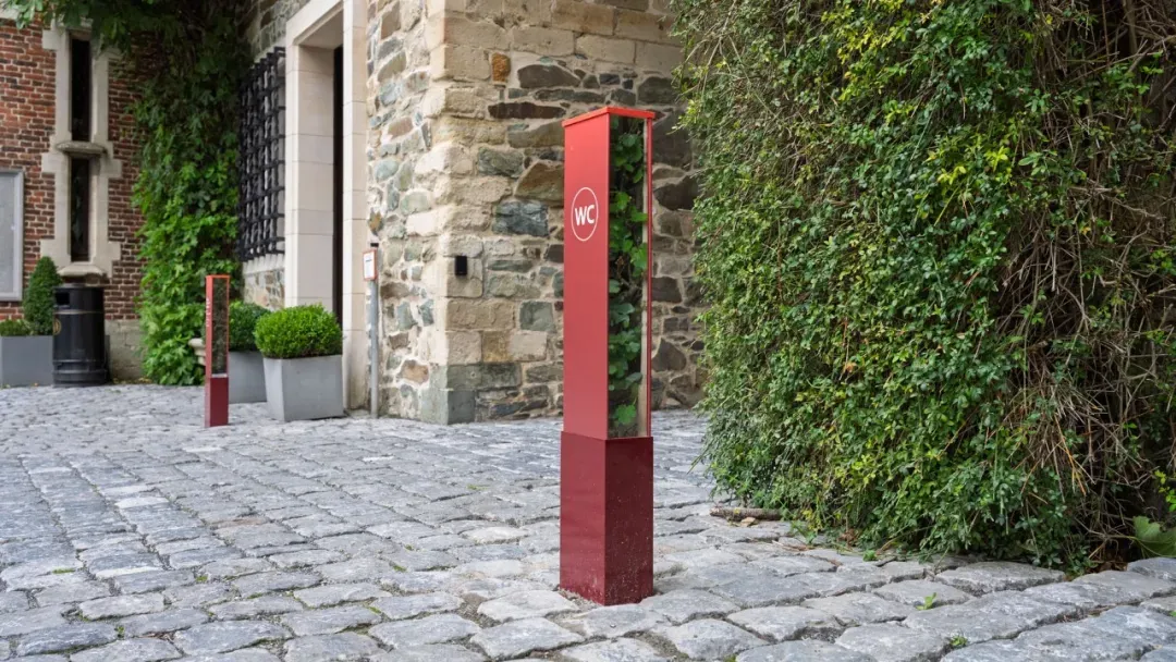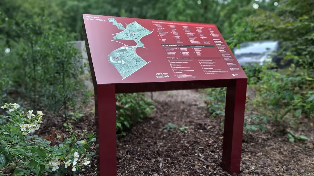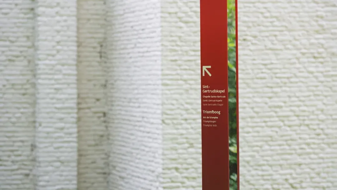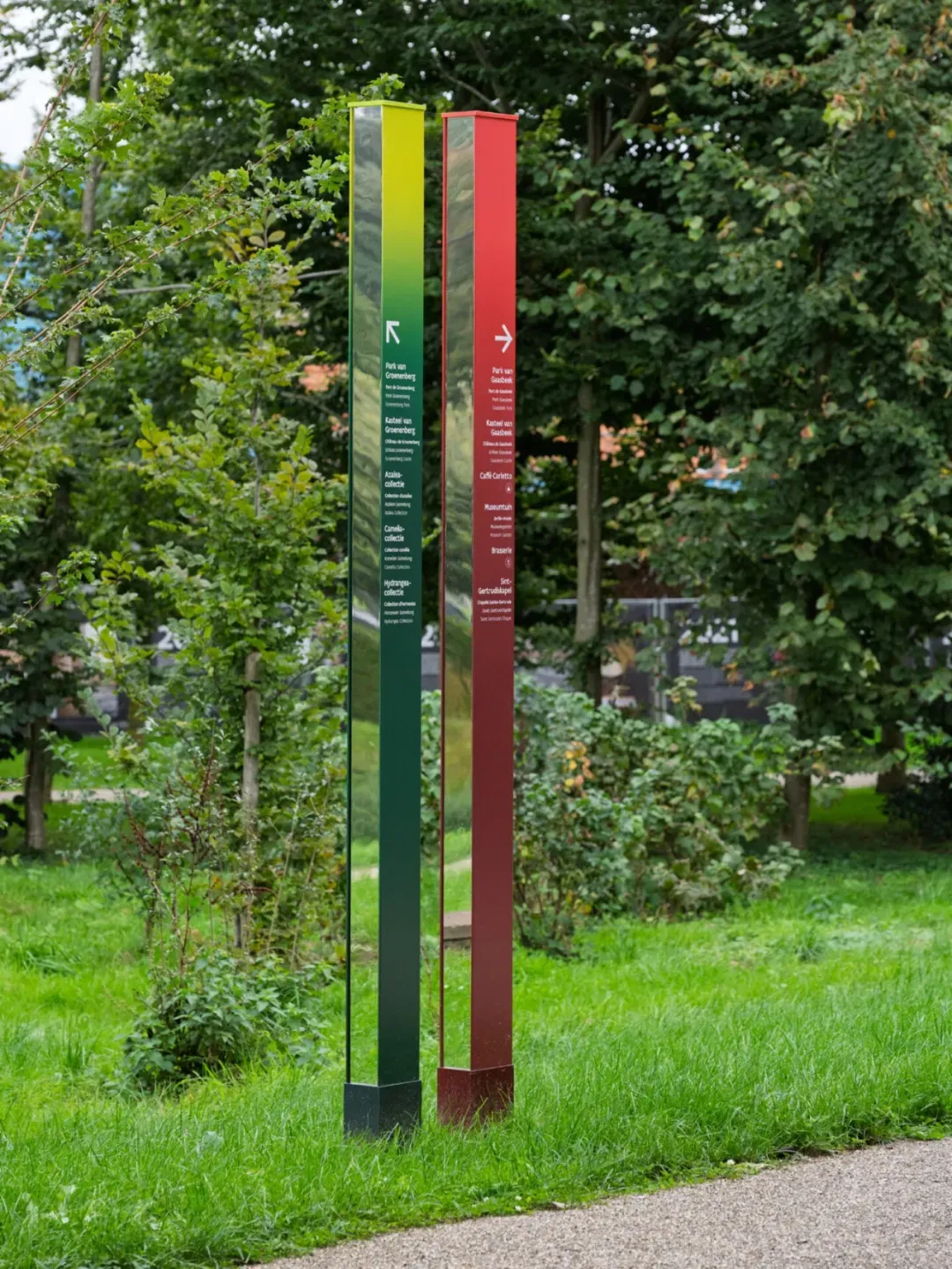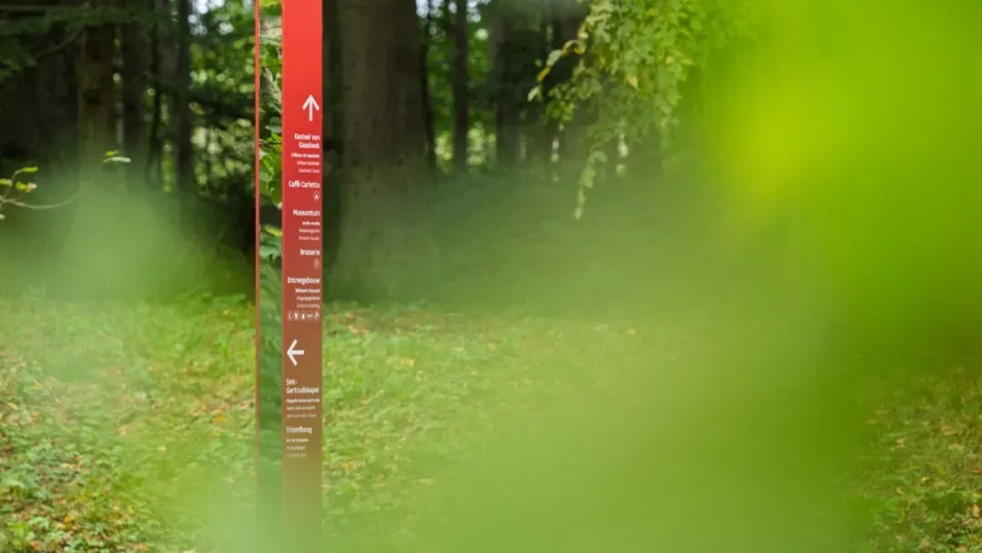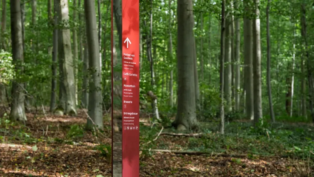 这组导视系统是现代简约风格与自然人文场景深度融合的优秀范例。它以醒目的酒红色为主色调,在森林与古堡环境中形成强烈视觉锚点,既保证了户外场景下的辨识度,又通过渐变色彩与镜面侧边弱化了工业感,让导视牌如同从环境中生长出来一般。此外,红绿双色导视柱的区分,让访客能快速识别不同游览路线,大幅提升了导视的功能性。