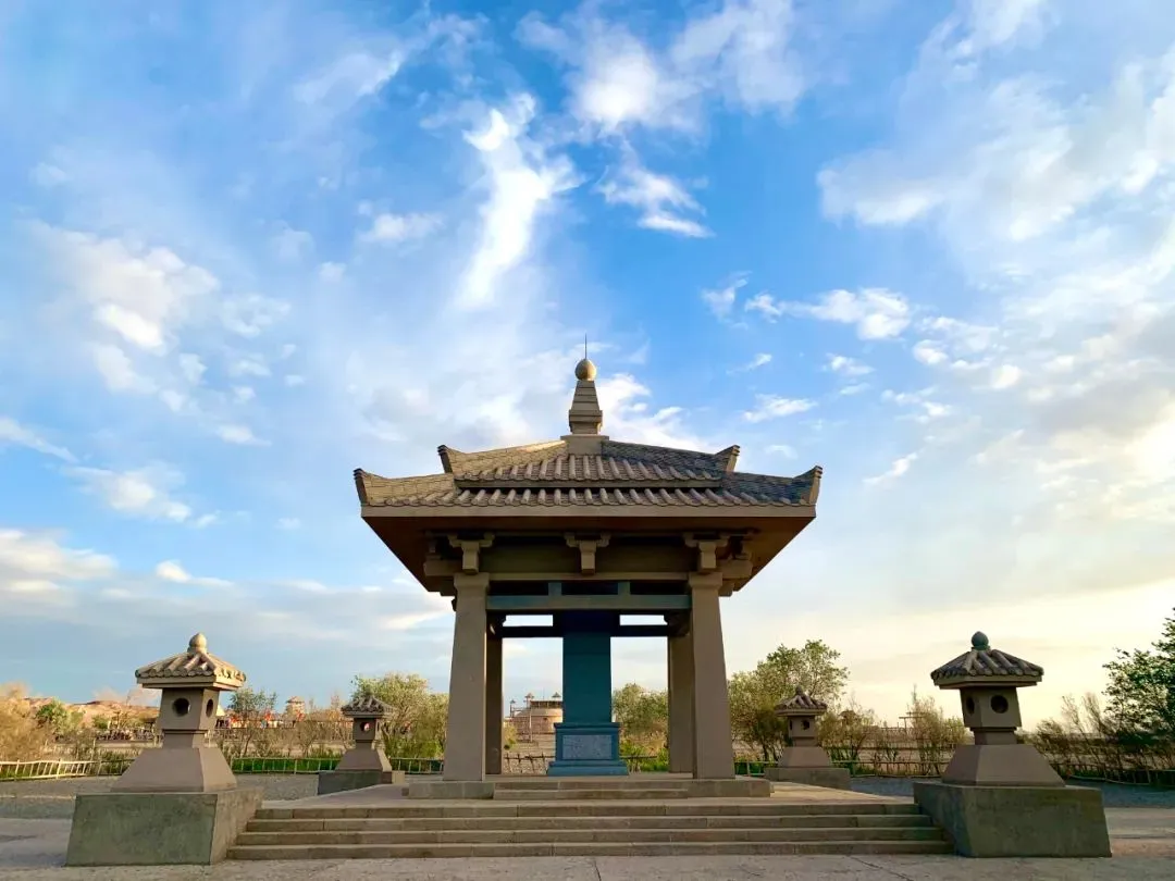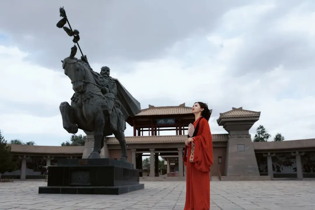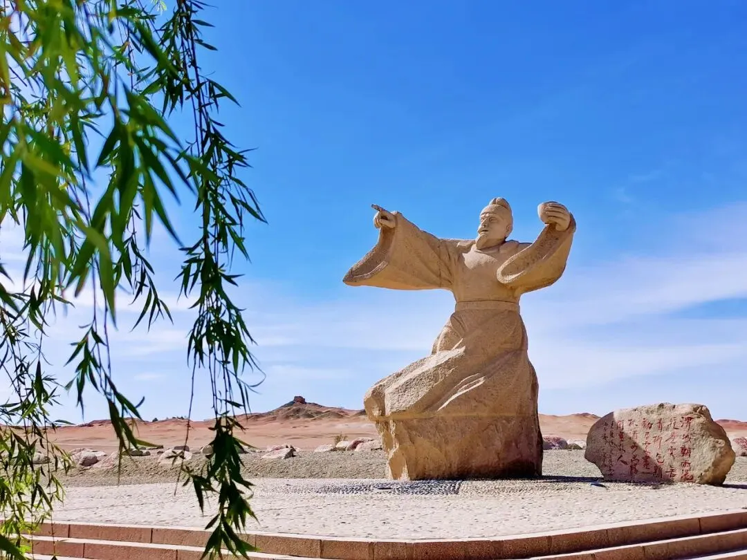 在王维雕像下吟诵边塞诗词,品读诗人们的离愁别绪、壮志豪情、家国情怀。王维雕像的身后,有一大片铺满巨石的戈壁,每一块石头上都用篆书雕刻着边塞诗句,以远处的阳关烽燧为背景,坐在石头上拍一组照片,绝对美艳。