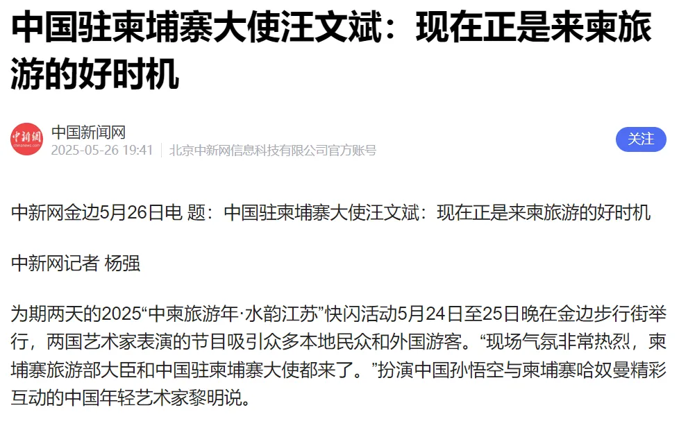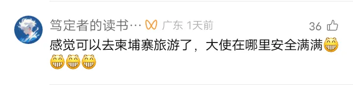 有人表示说,“这是最重量级的代言人。” 也有网友说:“有汪大使做代言,放心去一游,安全回来。” 还有人表示,2016年和2023年曾经两次自由行柬埔寨,感觉还是很安全的。 柬埔寨旅游部大臣表示,如果有游客来柬埔寨游玩,我们一定会保证大家的安全,让大家感到宾至如归。请大家相信柬埔寨政府。作为旅游大臣,将和柬埔寨政府在各个领域共同努力,切实保护游客们的安全。并向世界特别是中国的游客展示柬埔寨旅游的无限潜力。 2025年的时候,汪文斌隆重推介:现在正是来柬旅游的好时机!