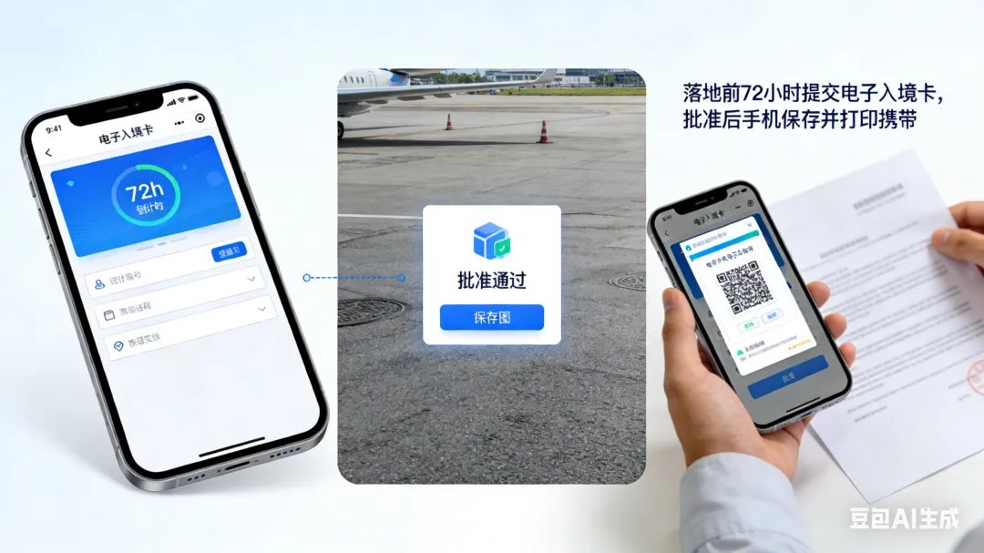 2. 落地前72小时,务必提前提交电子入境卡;批准后,手机保存,并建议打印携带。