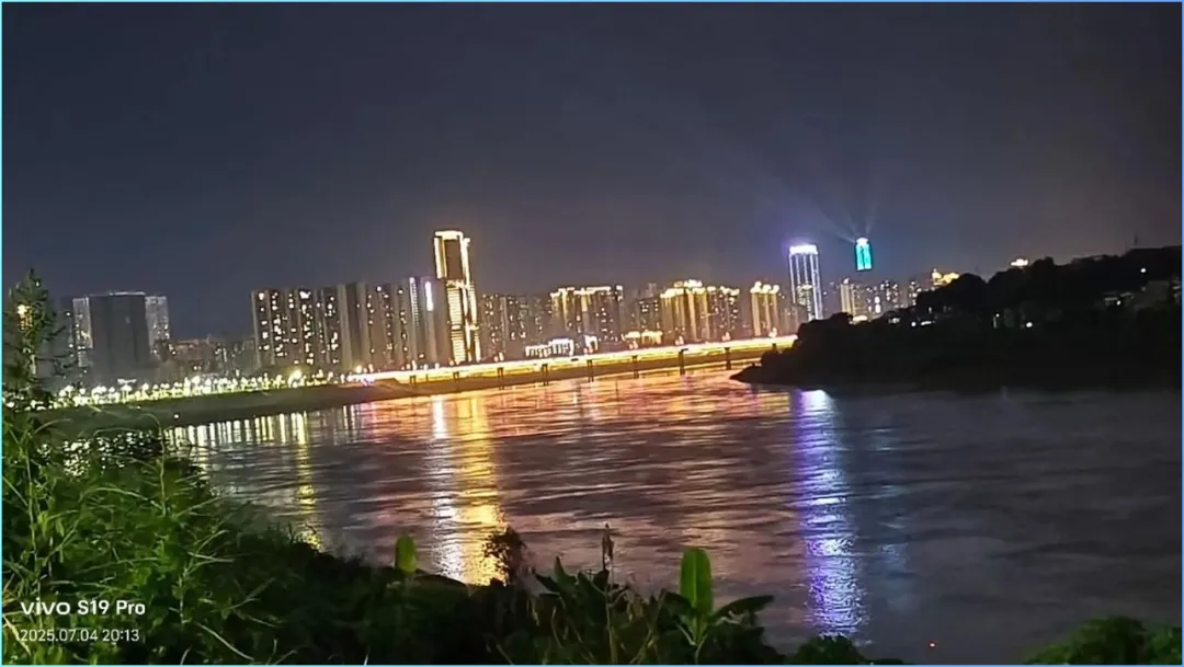 天完全暗下来,路灯亮了,灯光打在江面上,像一条条金色的绸带在水里游动。远处有船开过去,船尾拖着白色的水花,声音传过来是低沉的”呜呜”声,像沉闷的号角在夜里回荡。