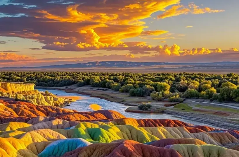 五彩滩是风蚀和流水一起雕的地貌,夕阳一照,像给石头刷了油彩,脚下是风,眼里是火。