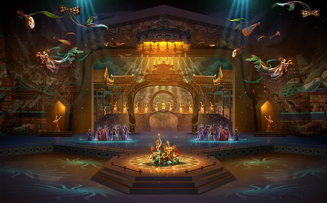 《乐动敦煌》是全球首部洞窟式沉浸体验剧,由甘肃演艺集团打造。该剧运用音乐、影像、灯光、机械装置及舞美道具等多种科技手段,结合演员真人演艺,再现敦煌音乐、舞蹈、诗歌、壁画等盛景。剧目活化敦煌古乐器、古乐谱研发成果,全面展现传承千年的古乐文化。自2023年6月首演以来,累计演出超2080场,接待观众破百万人次,形成了“剧、艺、食、趣、学”融合业态。