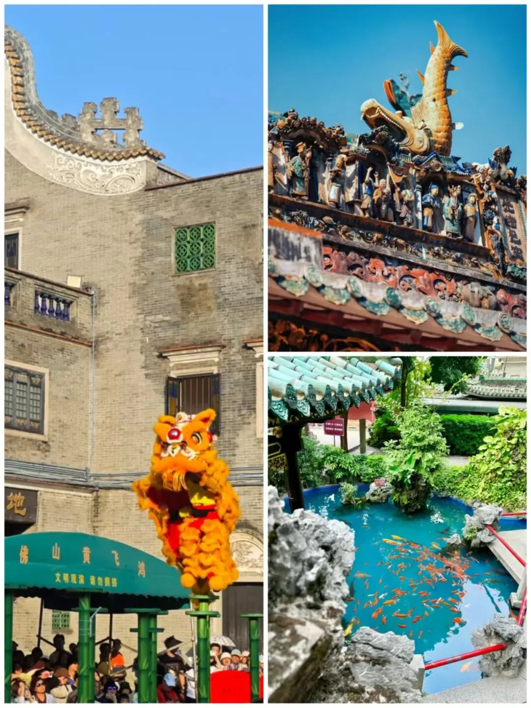 饭后步行至祖庙,门票20元/人。祖庙远不只是一座庙宇,而是一个集岭南建筑艺术、地方信仰、民俗文化与城市历史于一体的“露天博物馆”。沿着中轴线,可以依次参观万福台(华南最古老的戏台)、灵应牌坊、锦香池、三门、前殿和正殿等。每一处建筑的屋顶、墙壁、梁柱上,都布满了精美绝伦的雕刻,讲述着神话与历史故事。此外还设有黄飞鸿纪念馆和叶问堂,佛山是著名的武术之乡,这两个纪念馆系统展示了两位武术宗师的生平与精神。在黄飞鸿纪念馆外的广场上,每天有固定场次的武术和醒狮表演,非常精彩。