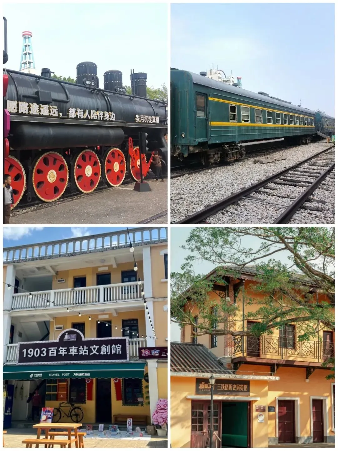 饭毕,阿珊带我们去了三水的百年车站,,其旧址曾是广东第一条铁路——广三铁路的终点站。它已不再承担运输功能,而是变身为一个充满文艺气息的铁路文化主题公园,包含广三铁路历史展览馆、民国风情街区、火车主题休闲设施等。