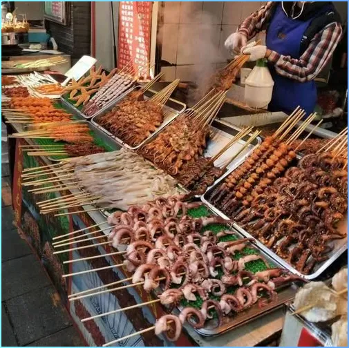 逛累了,去附近的小吃街。这条街不长,两边都是小摊小店,卖烤串的、卖煎饼的、卖炸串的、卖凉皮的,一家挨着一家。烤串摊前,炭火烧得旺,肉串在火上翻转,油滴下去,火苗蹿起来,带着一股子肉香。那种香是热的,是炸开的那种,整条街都是这个味。