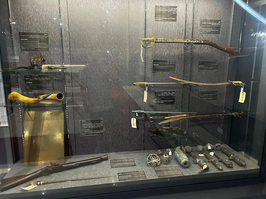(2)马尔代夫博物馆位于马累市中心的苏丹公园内,是在原来的苏丹王府邸基础上改建的,为一座三层楼房。馆内陈列着苏丹王朝的宝座、皇冠、古炮、刀枪、砍斧、长矛和从入侵者手中缴获的武器,还有古老的制作精良的和图案优美的手工艺品,如石刻、木雕和漆雕等。这一切都反映了马尔代夫是一个古老文明的国家。展品中有一支锃亮的铜制长枪,上面的字迹清晰,握手处颜色发浅,这是马尔代夫民族英雄穆罕默德·塔库拉夫·阿里·阿拉扎姆曾使用过的枪。他曾用这支枪打死了葡萄牙侵略国的首领,继而全歼葡军,赢得自由和独立。它是马尔代夫人民追求自由和独立的象征。